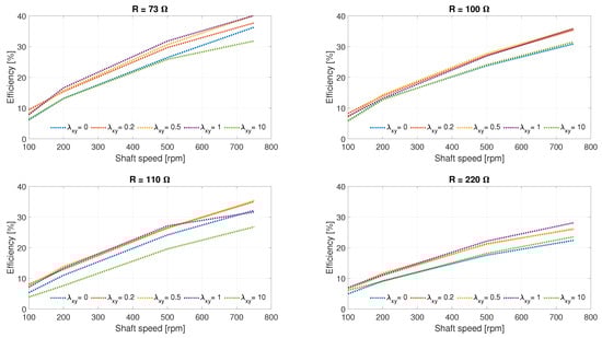 Finally, the motor load has a direct impact on its efficiency. Under light loads, corresponding to high resistances (220 ), the required torque is low, so fixed losses such as iron and switching losses represent a larger relative share, resulting in low overall efficiency. As the load increases, with lower resistances (110, 100, or 73 ), the torque rises and the motor operates closer to its nominal point, improving relative efficiency because the fixed losses are diluted compared to the useful power. However, if the load becomes too high and currents increase significantly, copper losses increase quadratically with the current, once again leading to a reduction in efficiency.