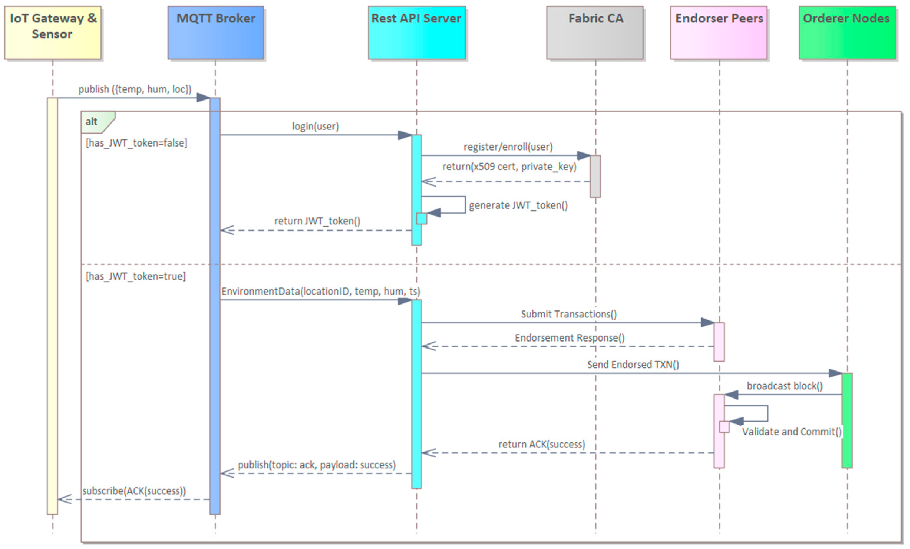 Figure 2, temperature, humidity, and location data from IoT sensors are first transmitted via an MQTT broker. If not linked to a verified user, A JSON Web Token (JWT)-based authentication process is initiated through the API server. During this process, Fabric CA registers and enrolls the user, generating digital credentials (x.509 certificate and private key). A JWT is then created and returned to the client for authenticated interactions. This process is detailed in