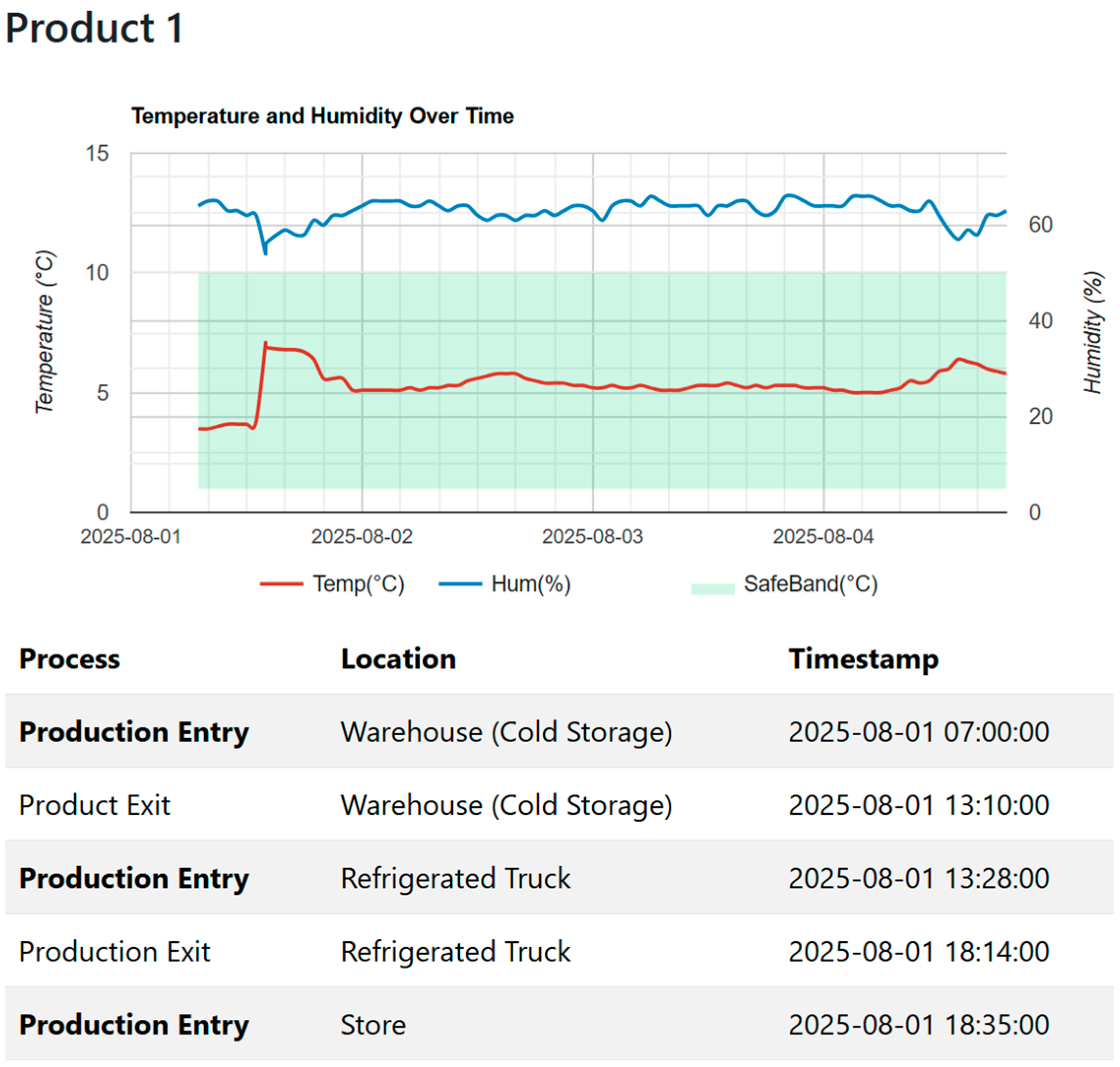 Figure 5 presents the historical temperature and humidity values of a sample product in a time-dependent graphical format. In the system, a predefined permissible temperature range (SafeBand) is assigned to each product record and visualized as a green zone on the graph. Through graphical monitoring, users can easily determine whether the product has remained within the defined limits during transportation. As illustrated, the temperature and humidity of the sample product remained within the safe range throughout its transportation, indicating no violations occurring during the chain.