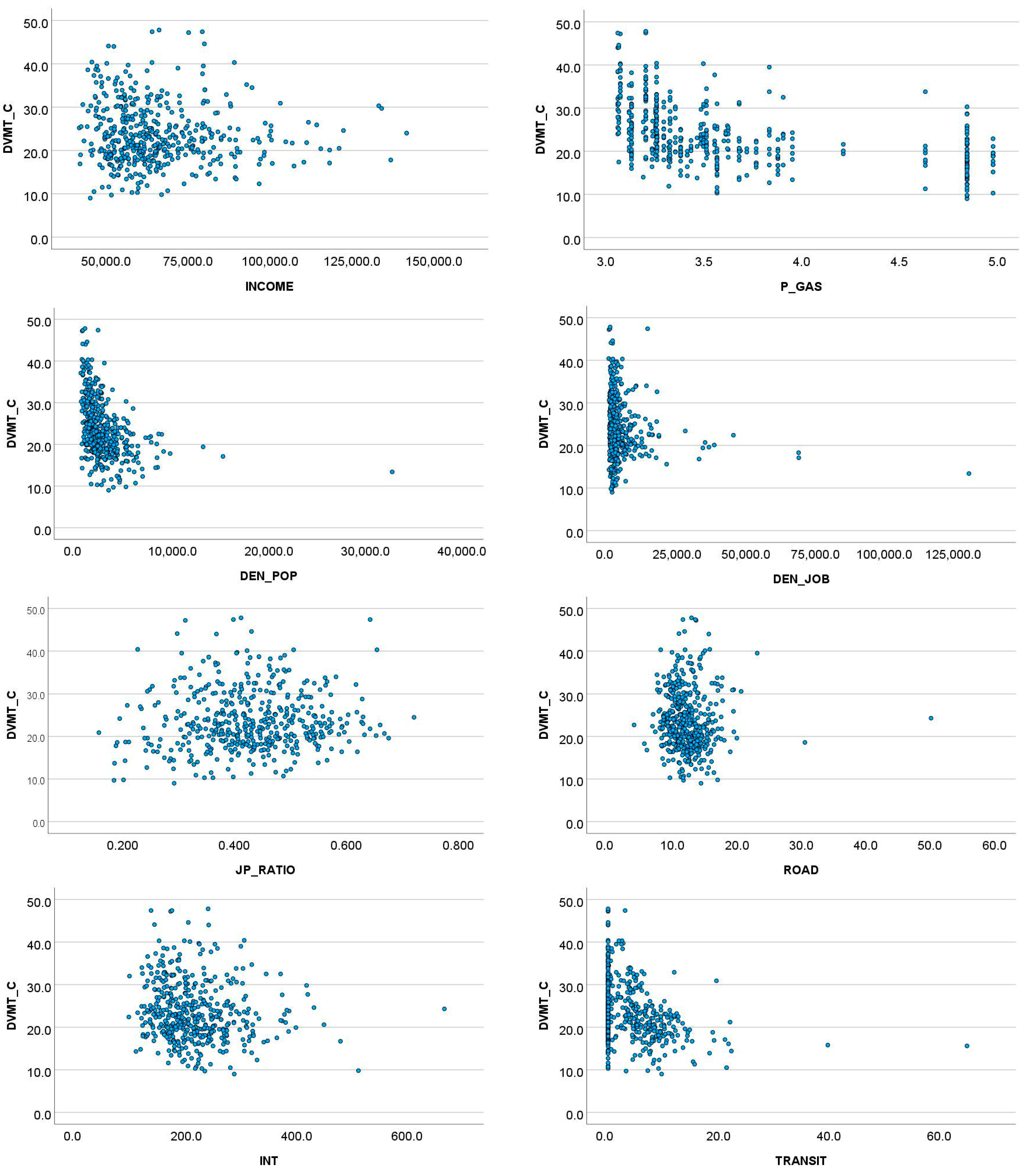 | Independent Variables | DEN_POP DEN_JOB JP_RATIO ROAD INT TRANSIT | DEN_POP DEN_JOB JP_RATIO ROAD INT TRANSIT POP_GRAD (Monocentric) JOB_GRAD (Monocentric) PWD_CEN LPI | DEN_POP DEN_JOB JP_RATIO ROAD INT TRANSIT POP_GRAD (Polycentric) JOB_GRAD (Polycentric) PWD_CEN LPI SUBCEN |