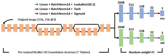 We extract features of the original image using a pre-trained CNN of the ResNet50 structure. Then, they are used to yield the mean and standard deviation of the Gaussian distribution. Parameters related to the fully connected (FC) layers are trained after random initialization. We use the tanh activation function at the last layer to ensure the mean has a value between −1 and 1. We use the sigmoid function as the activation function in the last layer to provide a standard deviation that has a value between 0 and 1. The output of the actor network is continuous real values, and it is necessary to convert them into the range used in the Canny algorithm. For the high and low thresholds, we convert the actor network’s output into an integer ranging from 0 to 500. For the filter size of the smoothing window, we convert the output of the actor network into an integer value between 3 and 9.