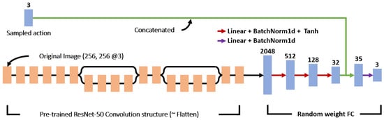 Figure 2 shows the structure of the critic network used in []. The input of the critic network is composed of an original image and action values, while a typical critic network uses only the current state as input. We randomly select action values from the normal distribution provided by the actor network and then use them as input for the actor network. The output of the critic network corresponds to the state value function . Since the critic network is a model that approximates the value according to each action, we use action values as the input of the critic network. Through this, we can guarantee that training will increase the probability of selecting proper actions from the normal distribution of the actor network. We do not use an activation function at the output layer in the critic network. It is based on the consideration that the critical network evaluates the accumulated return from the current state. In addition, we concatenate three action values with features from the pre-trained model in the middle of the fully connected layer to prevent them from being reflected in a small proportion.