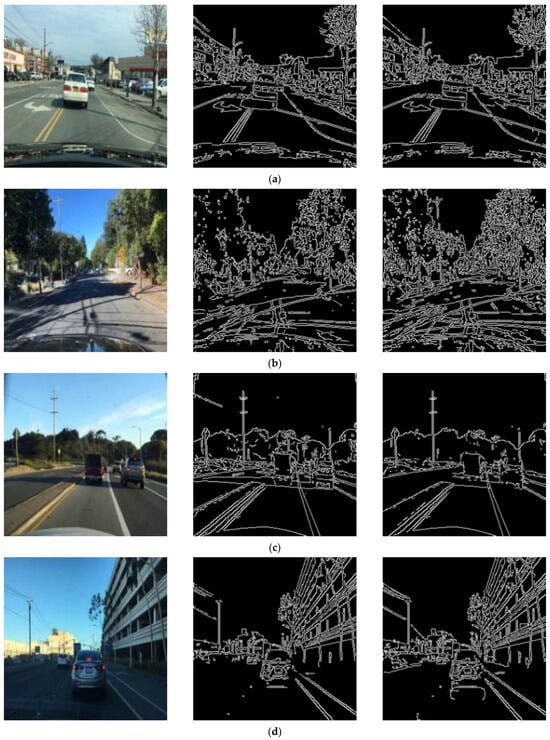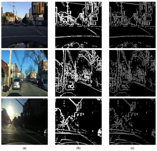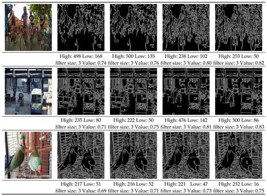 Image edge can be used for object detection, image segmentation, motion analysis, and 3D reconstruction [,,,]. Initially, filter-based and statistical analysis-based edge detection algorithms emerged [,,]. After the emergence of deep learning, edge detection is also performed using CNN [,,]. The Canny algorithm [] remains widely used for detecting edges in images. It requires setting the values of three parameters related to the smoothing window size and two thresholds in the hysteresis process.