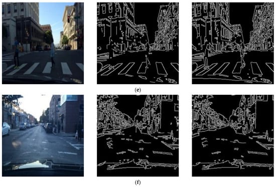 Medina-Carnicer et al. [] proposed an algorithm for the unsupervised determination of hysteresis thresholds by integrating the advantages and disadvantages of two thresholding algorithms. They find the best hysteresis thresholds among a set of candidates. In Mediana-Carnicer et al. [], an algorithm is proposed for automatically selecting hysteresis thresholds in the Canny algorithm, which can be utilized as an unsupervised edge detector. Unsupervised methods have the advantage that they do not require a learning process. However, they only provide evaluation results for a limited number of images. To assess their performance objectively, they must be evaluated in diverse scenarios with numerous images, such as those used in deep learning.