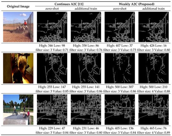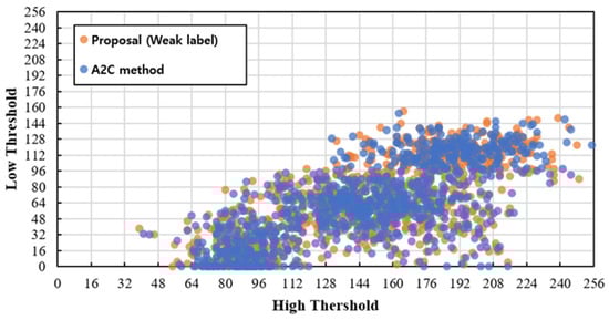 Figure 6 shows the distribution of high and low threshold values determined by each method for 1000 randomly selected images. As shown in Figure 6, the model’s results, trained according to the method proposed in this study, exhibit diverse distributions similar to those of the model trained using the A2C method []. This result suggests that the weakly supervised model successfully learns image-dependent threshold values with a distribution comparable to the supervised A2C model, demonstrating the effectiveness of weak labels in guiding parameter selection.