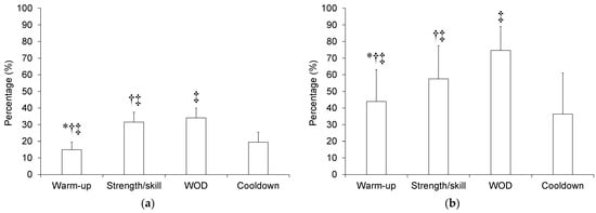 Relative contribution of each CrossFit® session phase to total effective duration (a) and total training load (b). WOD, workout of the day. *, significantly different from strength/skill phase (p < 0.01). †, significantly different from WOD (p < 0.01). ‡, significantly different from cooldown (p < 0.01).