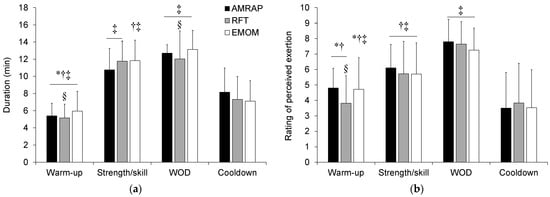 Duration (a) and ratings of perceived exertion (b) for each CrossFit® session phase according to WOD (Workout of the Day) type. AMRAP “as many repetitions as possible”; RFT “rounds for time”; EMOM “every minute on the minute”. *, significantly different from strength/skill phase (p < 0.01). †, significantly different from WOD (p < 0.01). ‡, significantly different from cooldown (p < 0.01). §, significantly different from EMOM (p < 0.05).