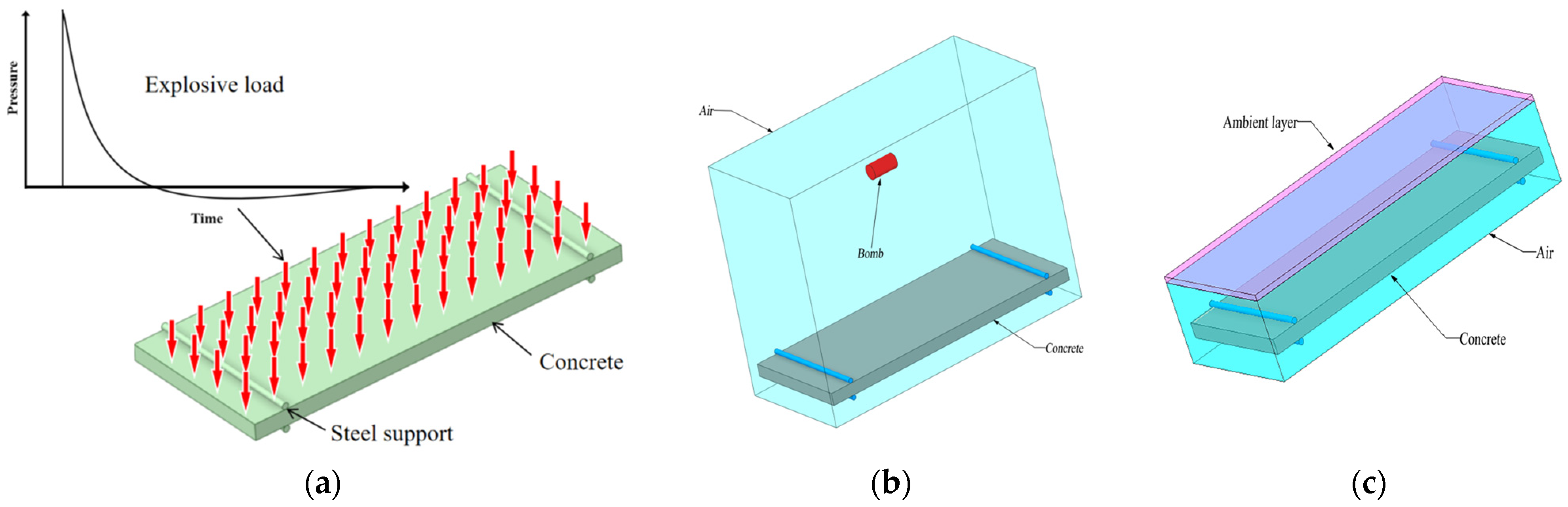 This paper is organized as follows: First, the blast-loading methodology, finite element model development, and material constitutive models employed in this study are described. Subsequently, key parameters including incident overpressure, peak displacement, residual displacement, and computational time are evaluated and compared across three algorithms at varying scaled distances. Differences in algorithmic outcomes and their underlying causes are analyzed. Finally, the principal research findings are summarized. The advantages, limitations, and applicable scope of the three algorithms are discussed, with specific emphasis placed on the superior computational efficiency and applicability of the CONWEP-ALE coupling algorithm for blast analysis of RC slabs.