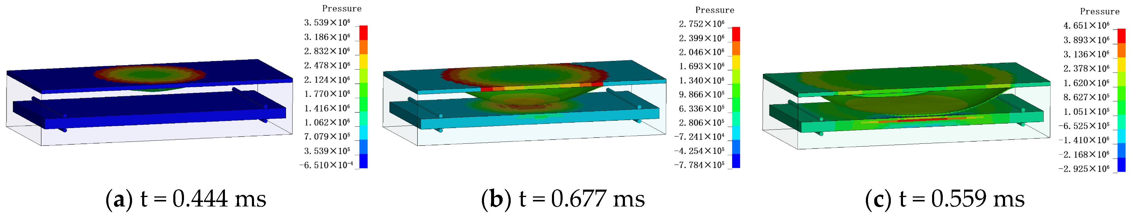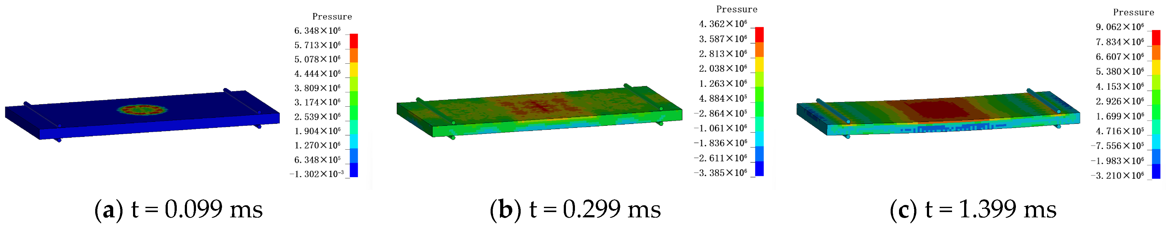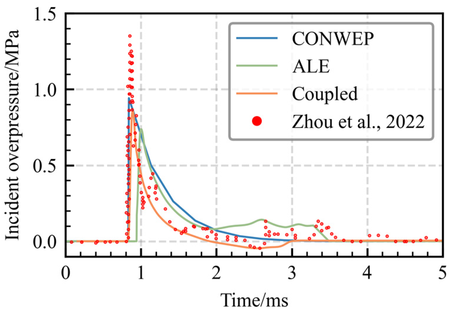 Figure 10 present incident overpressure results from the CONWEP, ALE, and CONWEP-ALE coupling algorithms. The CONWEP algorithm calculated incident overpressure using empirical formulas. In both the ALE and CONWEP-ALE coupling algorithms, incident overpressure was monitored using a single tracer point located in the air domain. The tracer was positioned 0.01 m from the center of the blast-facing surface of the RC slab. Pressure-time histories were recorded at a sampling frequency of 10