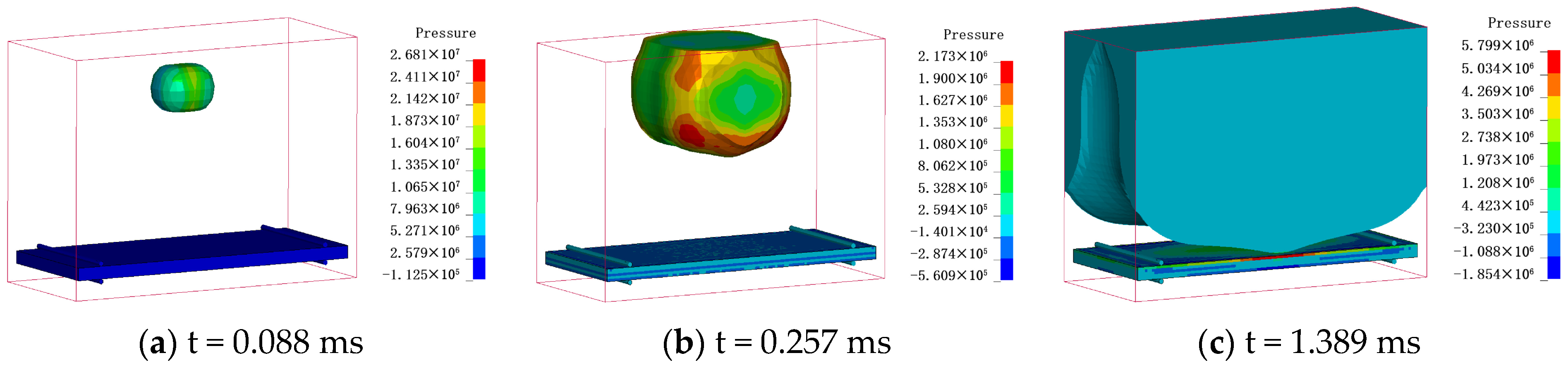 To ensure parametric consistency across blast simulations, the explosive load parameters in both CONWEP and CONWEP-ALE coupling algorithms, along with explosive placement in the ALE algorithm, strictly corresponded to the three experimental scenarios detailed in