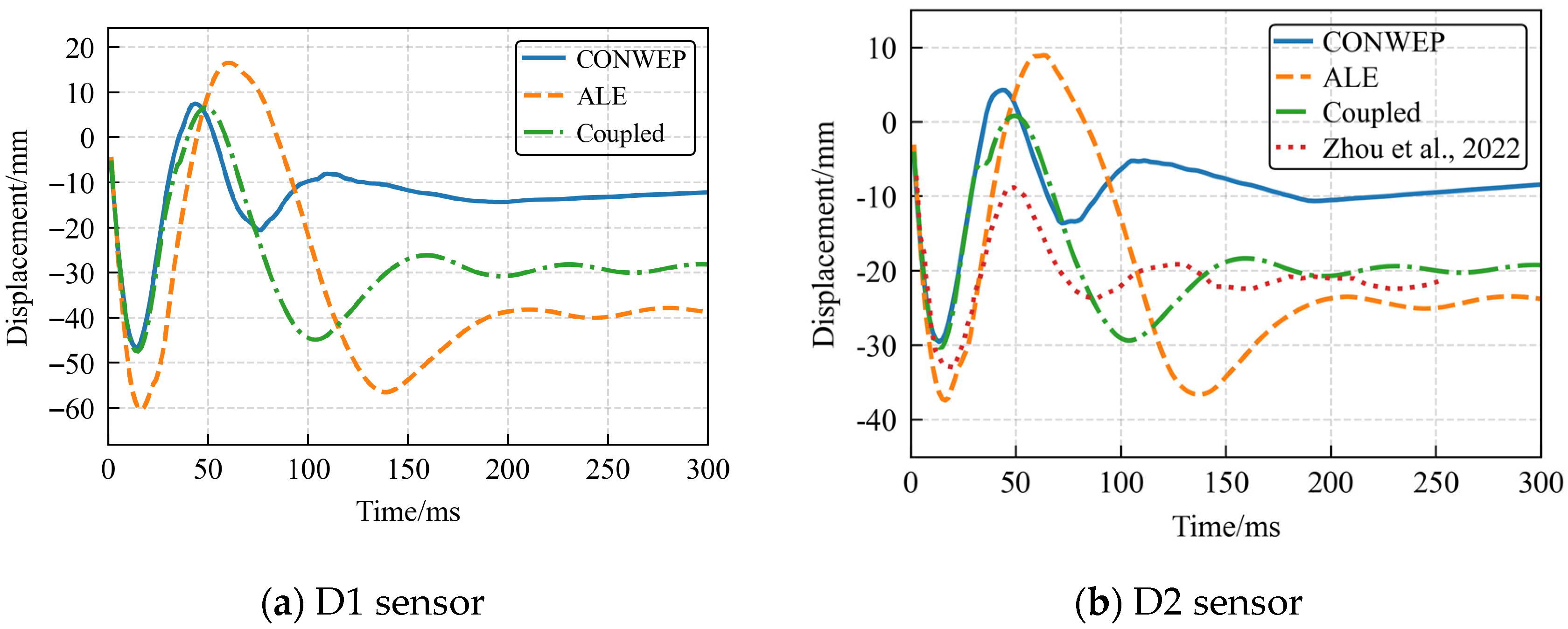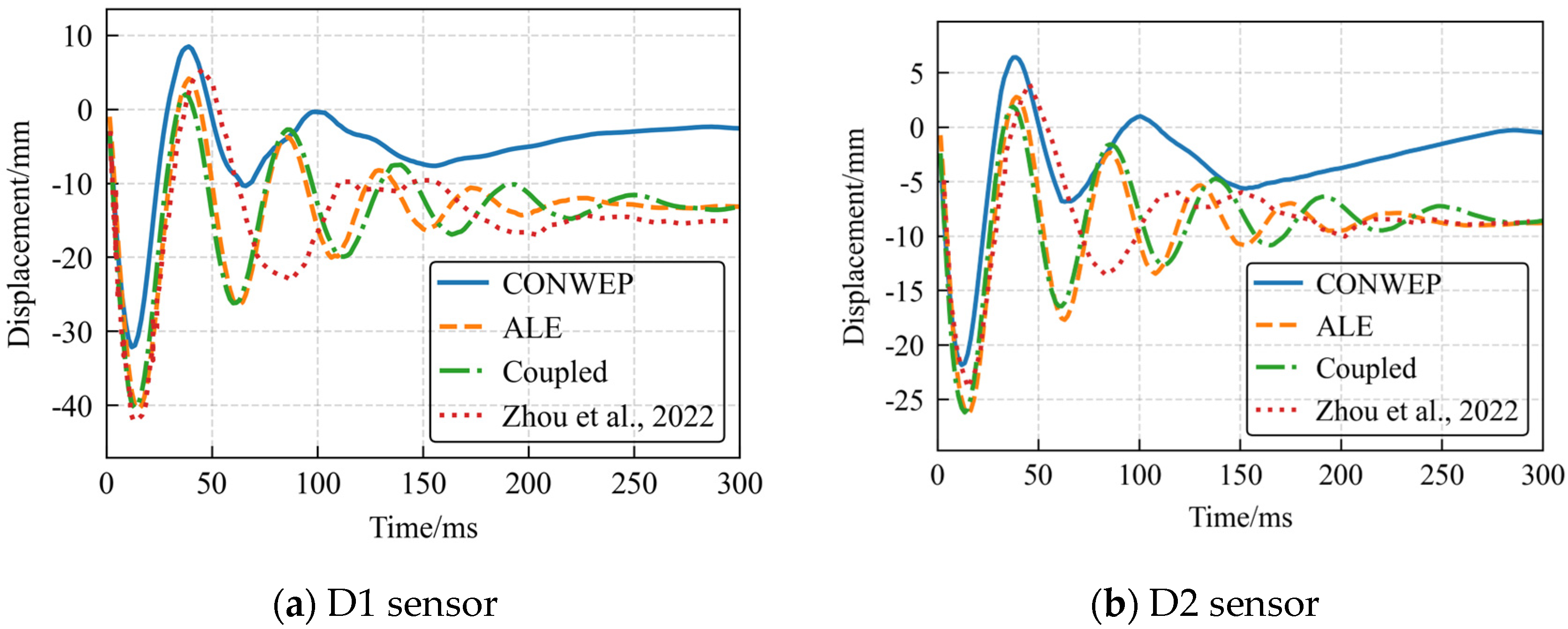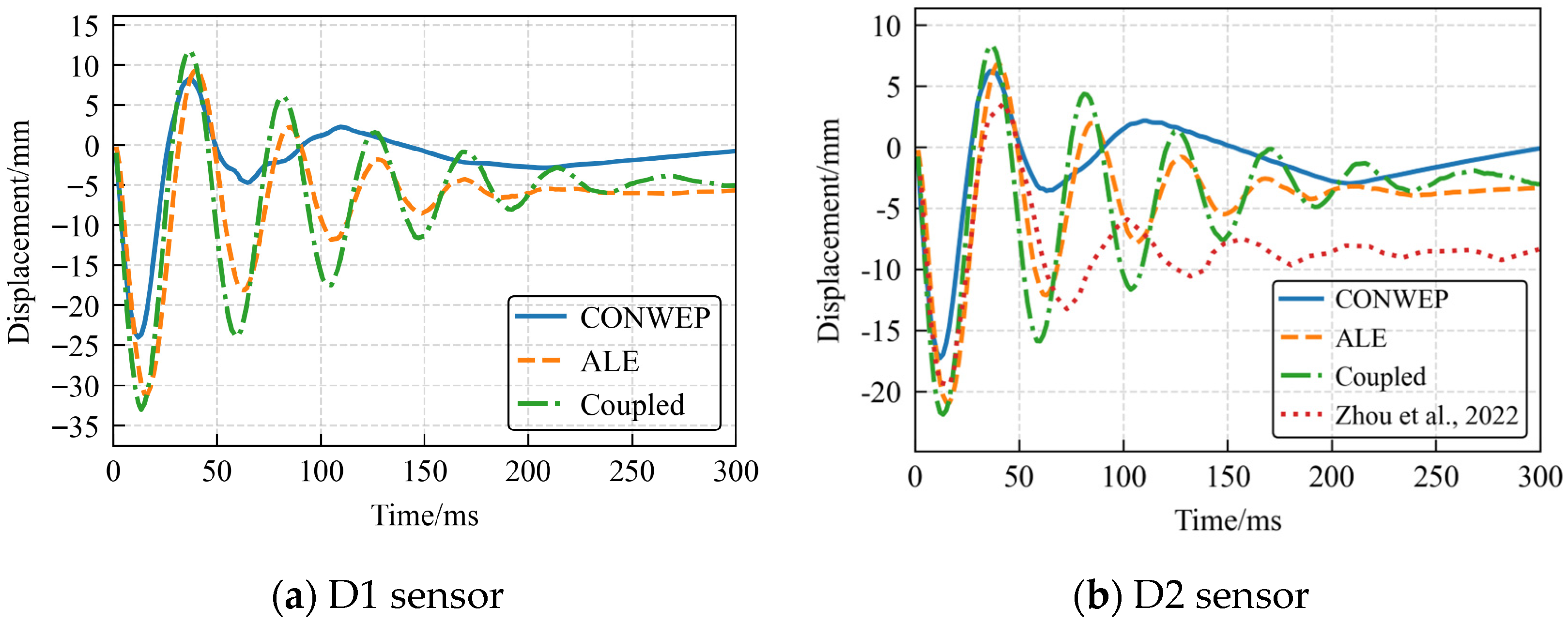 Figure 13). These curves compare results from the CONWEP algorithm, the ALE algorithm, and the coupled CONWEP-ALE approach. Note: Displacement data for D1 at scaled distances of 1.0 m/kg
