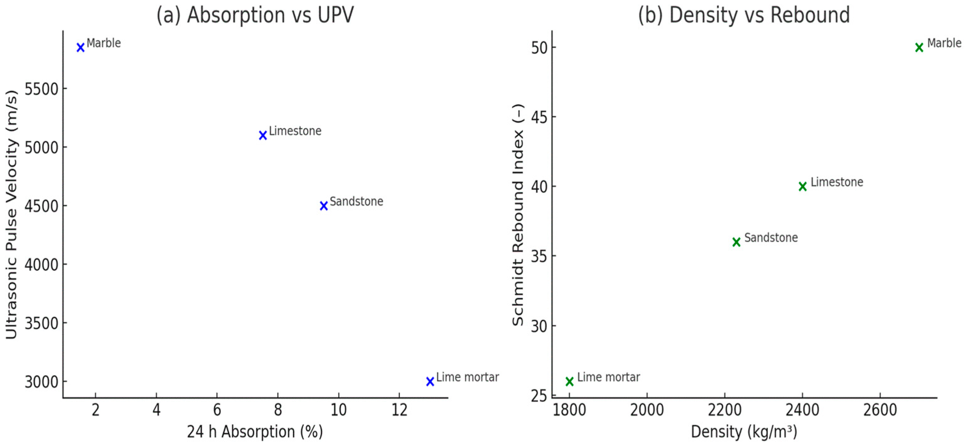 The pilot tests followed non-destructive protocols, ensuring heritage integrity while validating predictive models in line with sustainable engineering practice. The mini-experimental data (Table 5, Figure 1) supported the regression relationships. Lime mortar recorded the lowest density (≈1800 kg/m3) and highest absorption (≈13%), with correspondingly low UPV (≈3000 m/s) and rebound values (≈26). Sandstone and limestone were denser (≈2200–2400 kg/m3) with moderate absorption (7–10%) and intermediate strength indices. Marble was the densest (≈2700 kg/m3) and least absorptive (<2%), with the highest UPV (≈5850 m/s) and rebound (≈50). Figure 3 illustrates these relationships. Absorption is inversely correlated with UPV, confirming that porous and moisture-sensitive materials (e.g., lime mortar) exhibit lower structural indices. Conversely, density shows a positive correlation with Schmidt rebound index, highlighting the robustness of dense stones such as marble and limestone. Non-destructive validation plots: (a) inverse relation between water absorption and ultrasonic pulse velocity (UPV), and (b) positive correlation between density and Schmidt rebound index for lime mortar, sandstone, limestone, and marble. The plots validate predictive models linking porosity, strength, and density with durability performance. Together, these plots reinforce the inverse porosity–strength trend (Equation (1)) and the positive density–strength proxy relation, validating the classification of moisture-sensitive versus robust materials. These results confirmed the inverse porosity–strength trend (Equation (1)) and the positive density–strength proxy relation, reinforcing the classification of moisture-sensitive versus robust materials.