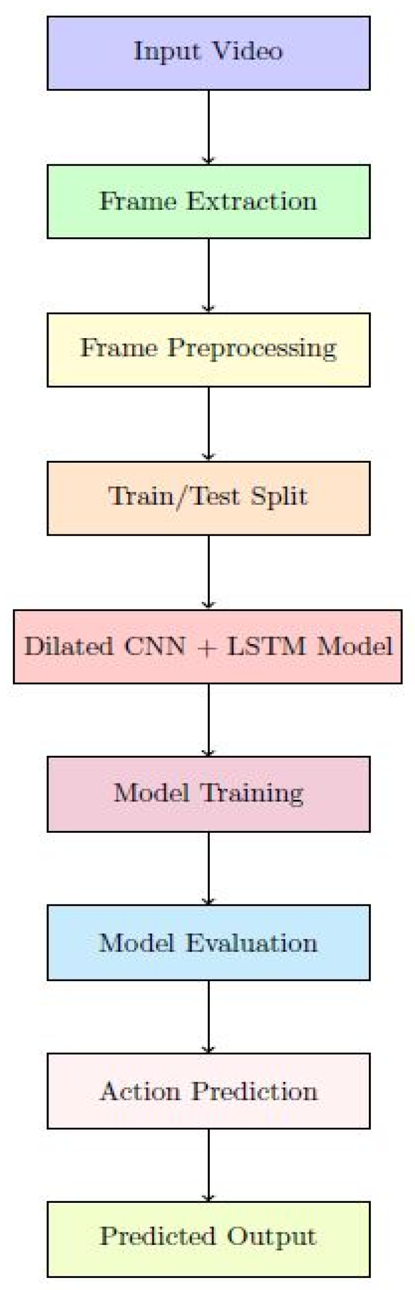The incorporation of dilated convolutions in the CNN layers enables the model to expand its receptive field, allowing it to capture more extensive spatial patterns without a corresponding increase in computational cost. This improvement enhances its ability to recognize complex spatial and temporal features across a larger context. Additionally, by integrating Long Short-Term Memory (LSTM) units, the model is able to effectively learn and predict dynamic sequential dependencies, making it well-suited for action recognition tasks. This combination of dilated convolutions and LSTMs results in superior performance compared to conventional CNN and CNN-LSTM models.