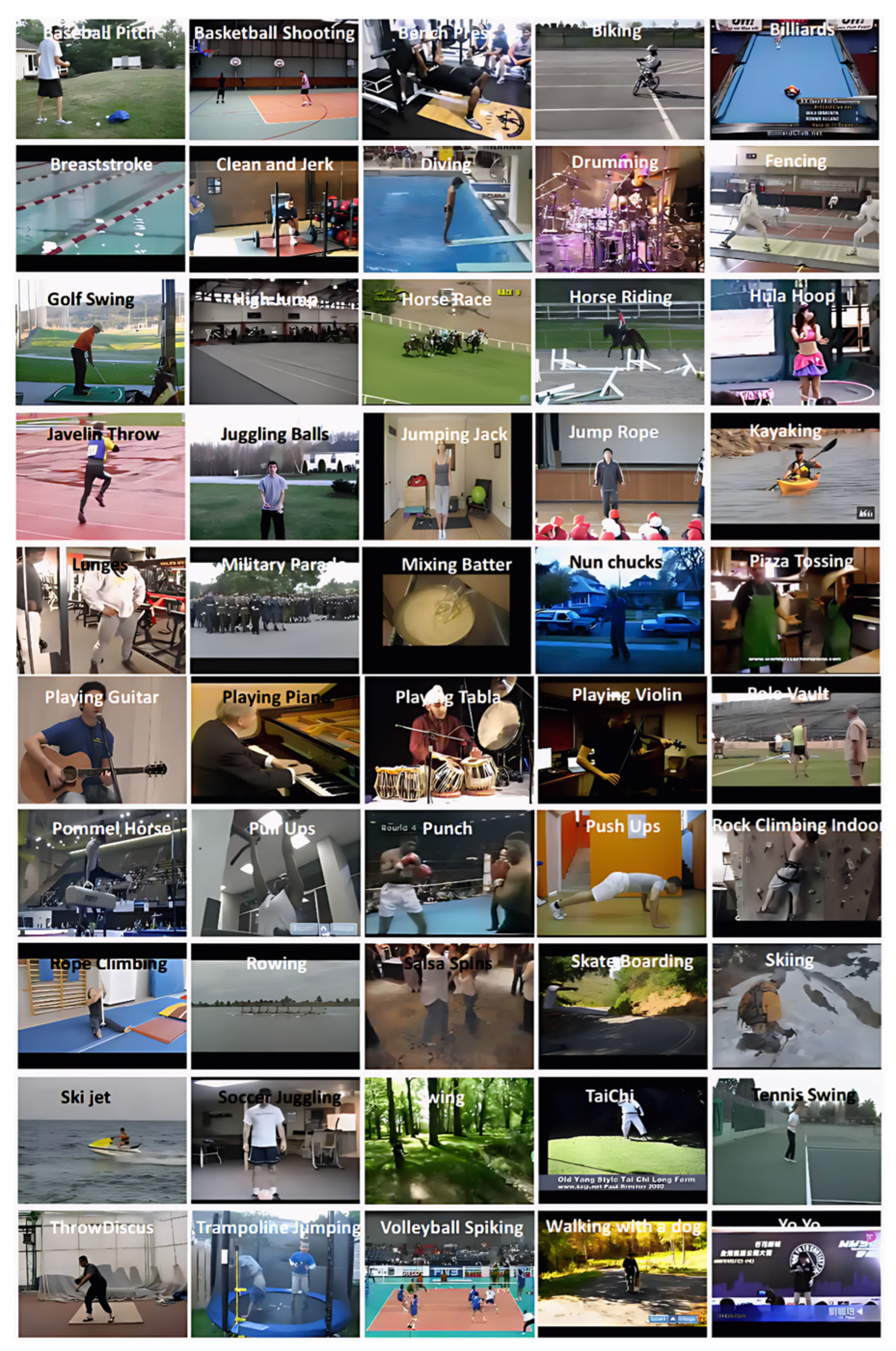 Figure 5. It provides the computer vision community with challenging, real-world scenarios to test the robustness of action recognition models. One of the primary strengths of this dataset is its diversity and complexity. The videos exhibit significant variations in factors such as camera motion, object appearance, pose, scale, and viewpoint, alongside varying illumination conditions and cluttered backgrounds. These variations make the dataset highly challenging and suitable for evaluating models’ performance in real-world scenarios. The dataset is organized into 50 action categories, which are further divided into 25 groups per category. Each group contains at least four video clips, often sharing common traits like the same individual, similar backgrounds, or comparable viewpoints, thereby testing models’ ability to generalize across different contexts. The 50 action classes span a wide range of activities, including both sports and everyday actions. Some of the notable categories are Basketball Shooting, Bench Press, Billiards Shot, Drumming, Horse Riding, Kayaking, Pull-Ups, Tennis Swing, Volleyball Spiking, and Walking with a Dog, among others. This diversity in actions, captured in realistic settings, makes UCF50 a valuable resource for advancing research in human activity recognition.