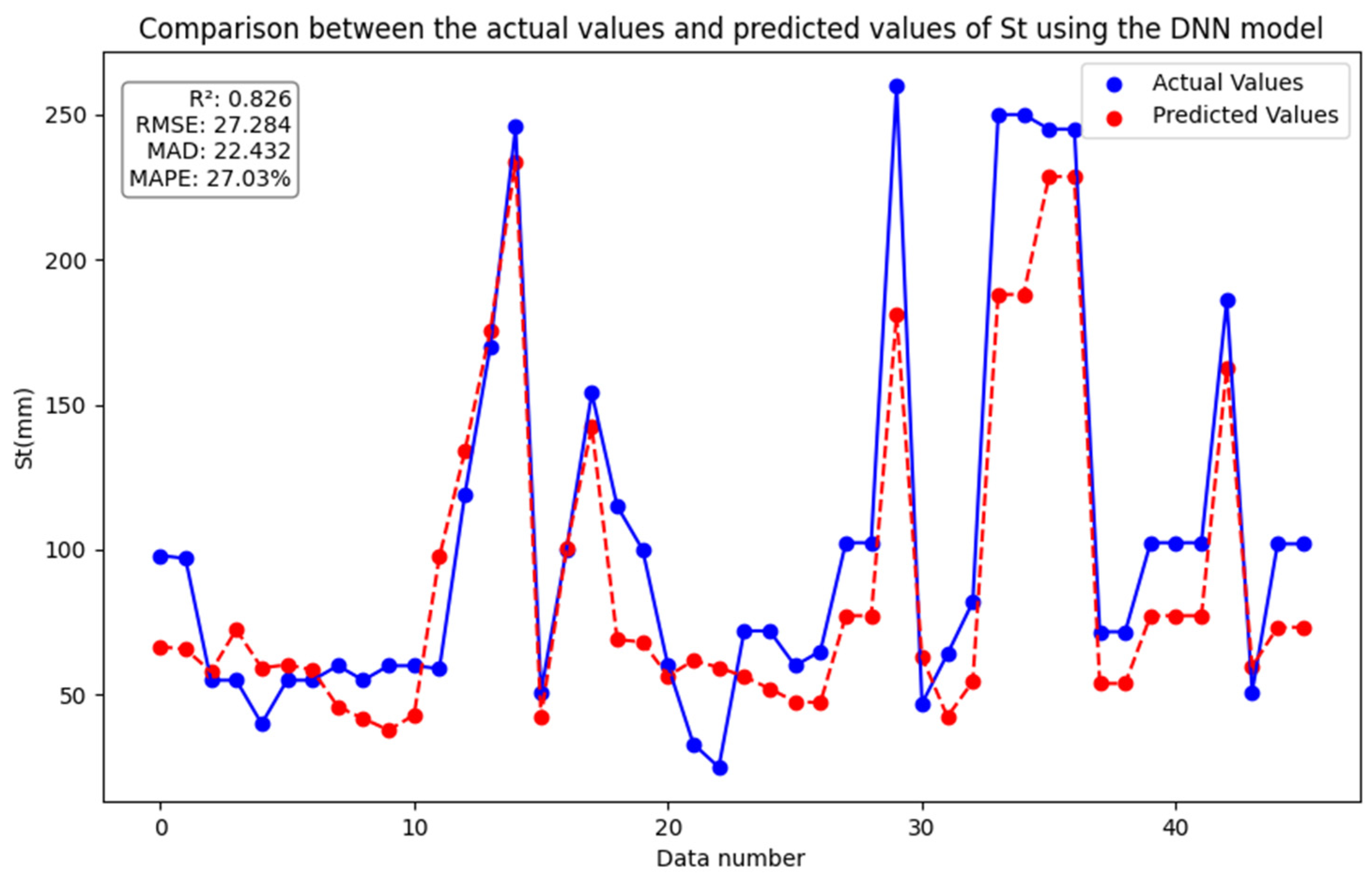 - The SVM-ensemble RF model proposed in this study predicts values that closely match the actual values and outperforms the other models, followed by XGBoost, SVM, RF, GBDT, and DNN. Therefore, the proposed ensemble model has very high predictive capability and can effectively capture the complex nonlinear relationships between soil layer characteristics and settlement.