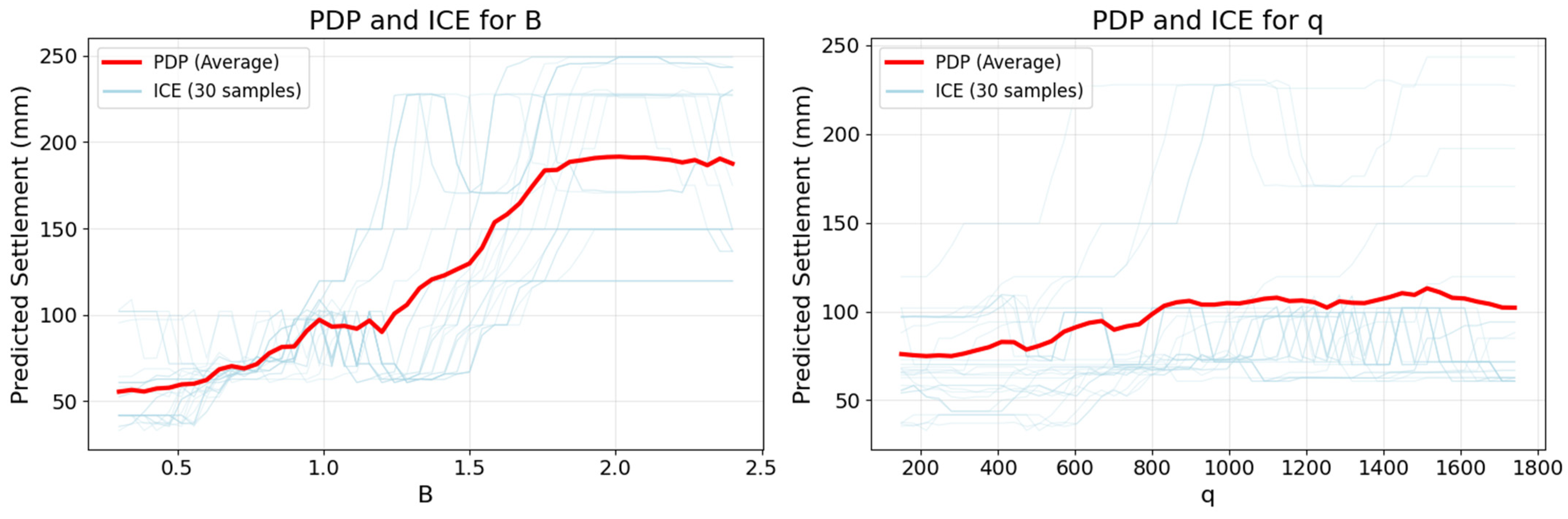 - This study employs Monte Carlo simulation to quantify the uncertainty of the ensemble model’s prediction results and conducts a sensitivity analysis. The results of uncertainty quantification all fall within the 95% confidence interval. The sensitivity analysis shows that, when using an SVM-integrated RF model to predict settlement values (St), the foundation width (B) has the greatest influence, followed by foundation load (q), and finally corrected cone tip resistance ().