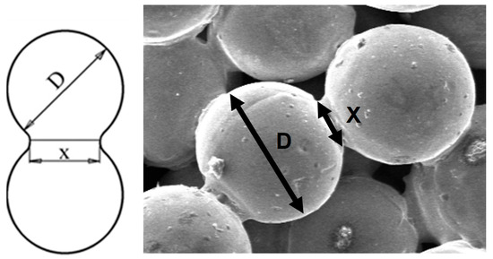 The degree of sintering was estimated on several SEM images (taken on a Jeol 5600-LV microscope—Akishima, Tokyo, Japan) in secondary electron configuration coupled with an energy-dispersive X-ray (EDX) spectrometer UltimMAX65 (Oxford Instruments, Aztec software, version 4.2, High Wycombe, UK) and calculated as the ratio between the sintering neck and the corresponding particle dimensions [35] as shown in Figure 2.
