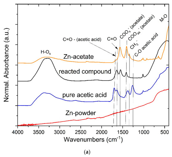Figure 3a presents the FTIR spectra of Zn powder, pure acetic acid, and the reacted compound, along with a reference spectrum of zinc acetate (SDBS No.: 2965). As expected, metallic Zn is essentially IR-inactive, showing no characteristic absorption features. Pure acetic acid exhibits a strong C=O stretching band near ~1715 cm−1 and C–O stretching modes below 1300 cm−1. In contrast, the spectrum of the reacted compound shows the disappearance of the sharp acid C=O band and the appearance of new absorption features in the 1600–1400 cm−1 region, corresponding to the asymmetric and symmetric stretching vibrations of the carboxylate (COO−) group. The separation (Δν) between these bands is approximately 150–170 cm−1, consistent with bidentate or bridging coordination of acetate ligands to the Zn2+ center [35]. These spectral changes confirm the conversion of acetic acid into zinc acetate.