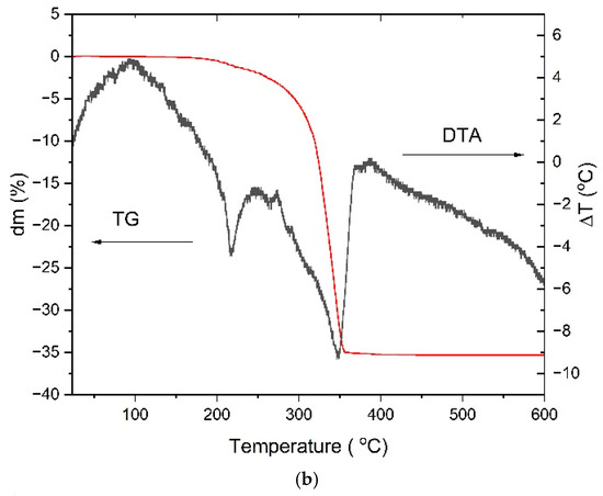 Thermogravimetric and differential thermal analyses (TG–DTA) were carried out in air from room temperature up to 600 °C at a constant heating rate of 10 °C min−1. The TG–DTA system was coupled to a quadrupole mass spectrometer (QMS 200, Residual Gas Analyzer, Stanford Research Systems-RGA—Sunnyvale, CA, USA) for evolved gas analysis. Gas transfer was achieved using a stainless-steel capillary, 120 cm in length with an inner diameter of 0.075 mm. To avoid condensation of water vapor and volatile decomposition products, the capillary was maintained at approximately 100 °C throughout the measurements. The mass spectrometer operated at an ionization energy of 70 eV under standard acceleration voltage conditions.