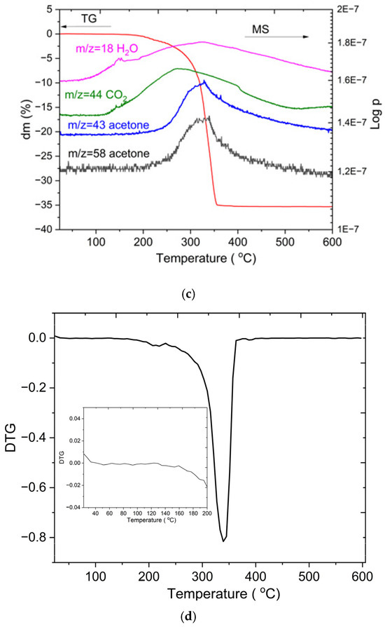 Figure 3b–d presents the thermogravimetric (TG/DTG), differential thermal analysis (DTA), and TG-mass spectrometry (MS) results of zinc acetate recorded in air at a heating rate of 10 °C/min. The TG and DTG data reveal two distinct features. The small mass change observed below ~100 °C, highlighted in the inset of the DTG curve, is attributed to the removal of adsorbed moisture or surface-bound species rather than structural dehydration of zinc acetate. The major thermal event occurs between 250 °C and 350 °C, corresponding to a significant mass loss of about 35%, which is assigned to the decomposition of zinc acetate and oxidation of organic fragments to ZnO. This process is accompanied by a strong exothermic peak in the DTA curve, consistent with the breakdown of acetate groups and formation of ZnO. Mass spectrometry of the evolved gases confirms the release of volatile organic species, including fragments attributable to acetone (m/z = 43, 58), as well as CO2 (m/z = 44) and H2O (m/z = 18). The strong correlation between the TG and MS data in this temperature range demonstrates the accuracy of the measurement and the rapid response (1 s) of the residual gas analyzer (RGA). The formation of acetone during the thermal decomposition of acetate ligands has been widely reported in the literature, further supporting our MS observations [37]. Above 350 °C, no additional mass loss or MS signals are detected, confirming the complete thermal conversion of zinc acetate to ZnO.