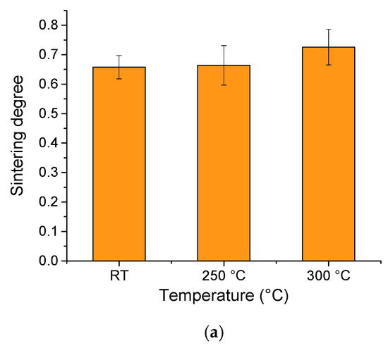 We did not notice a significant difference in the sintering degree with temperature (Figure 7). In the case of room temperature, we obtained 0.65. Upon increasing the temperature to 250 °C, it marginally increased to 0.66, and upon increasing the temperature to 300 °C, the sintering degree also increased slightly to 0.72.
