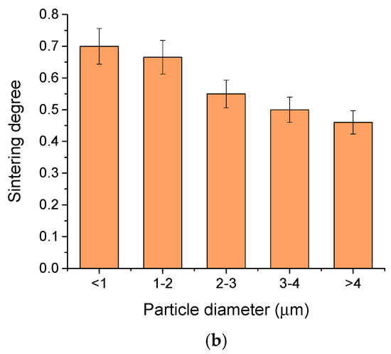 A decrease in the sintering degree was observed as the particle diameter increases (Figure 7b), similar with findings in the case of the classical sintering [35]. As the particle size decreases, the specific surface area increases, improving the sintering. In all cases, we observed a sintering degree over 0.6 which indicates good sintering in every sample.