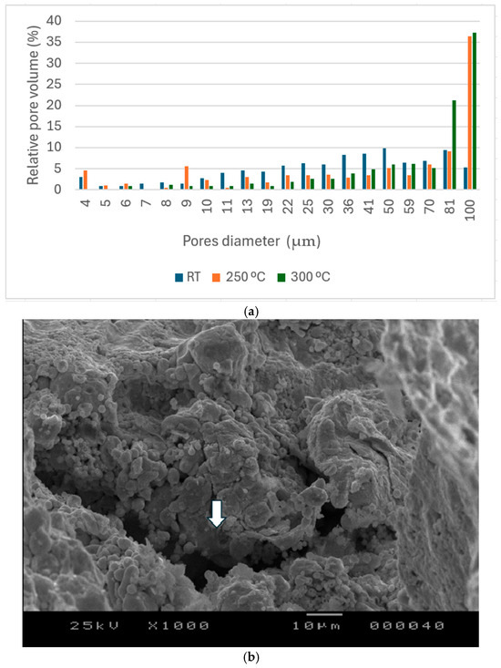 The pore size distribution in samples (p = 60%) sintered at different temperatures (a), and SEM images presenting narrow channels between the macropores (b).