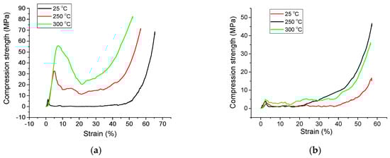 The first choice in evaluating the mechanical properties of metallic foams is the compression test. In the present case, we choose to evaluate samples having two porosities in the range typical for foams manufactured by powder metallurgy, namely 40% and 60% cold sintered at room temperature, 250 °C and 300 °C.
