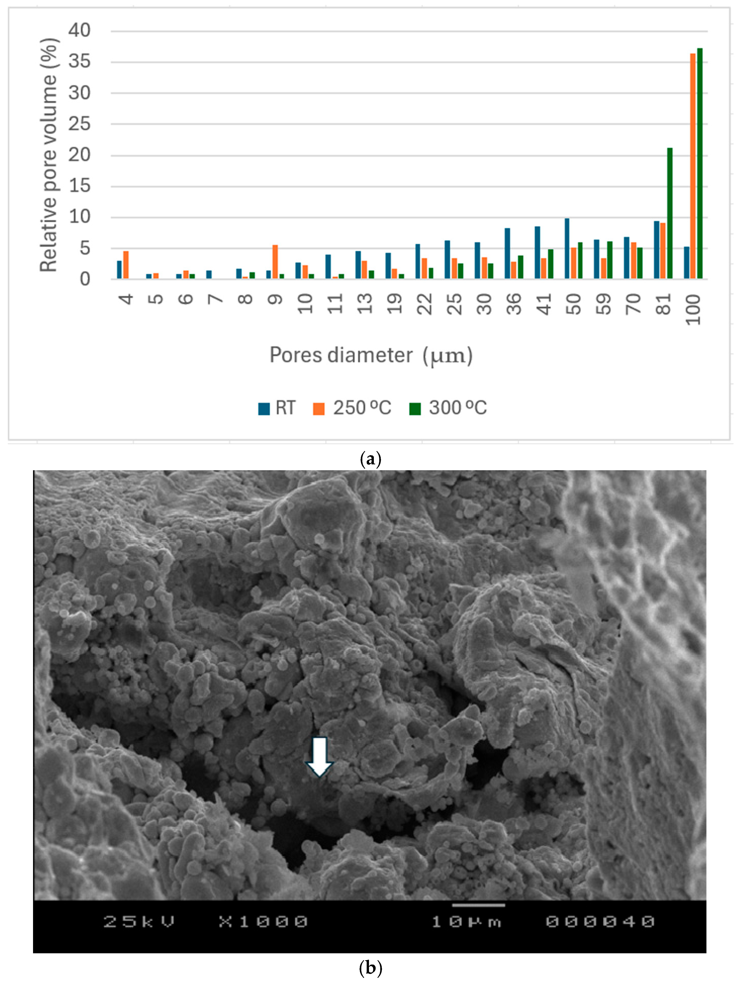 Table 2. The apparent pore size distribution is between 4 and 100 µm. The apparent increase in the high fraction of pores (90 µm and 100 µm) at higher sintering temperatures is linked to the transformation of the Zn-acetate to ZnO accompanied by a rearrangement that opens up the channels.