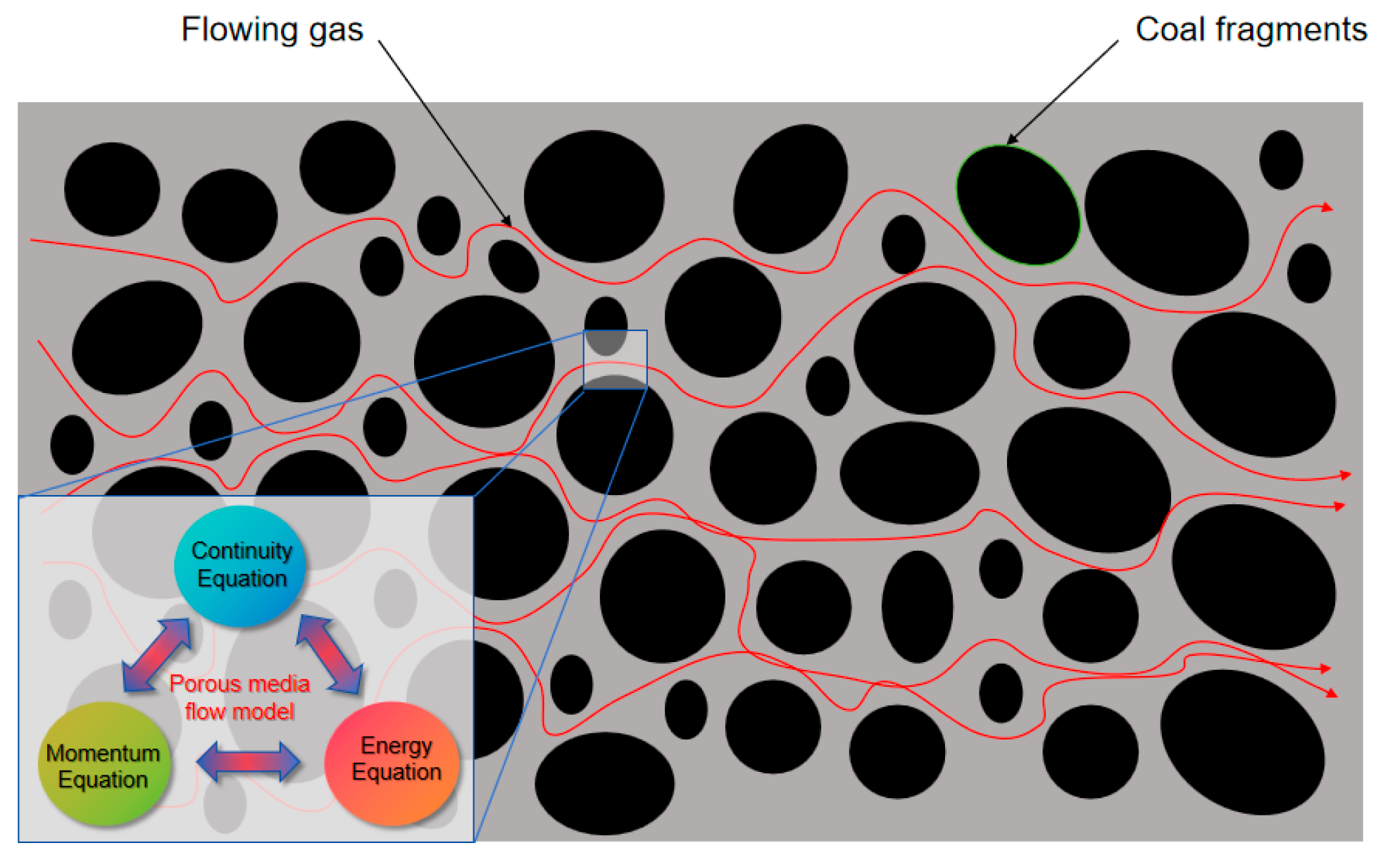 The energy conservation equation is employed to characterize temperature variations within spontaneous combustion zones of a goaf. In such a porous medium environment, heat generated by coal oxidation induces thermal transport phenomena during fluid movement through the porous medium [23].