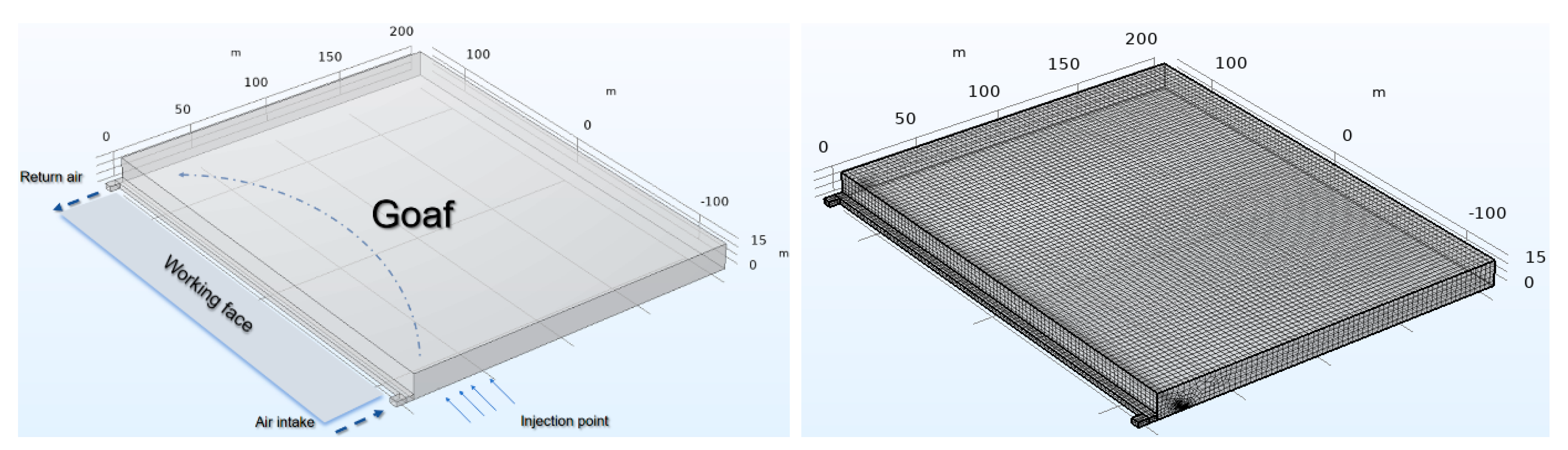 Figure 2. Numerical model and mesh distribution for CO2 injection in the goaf.