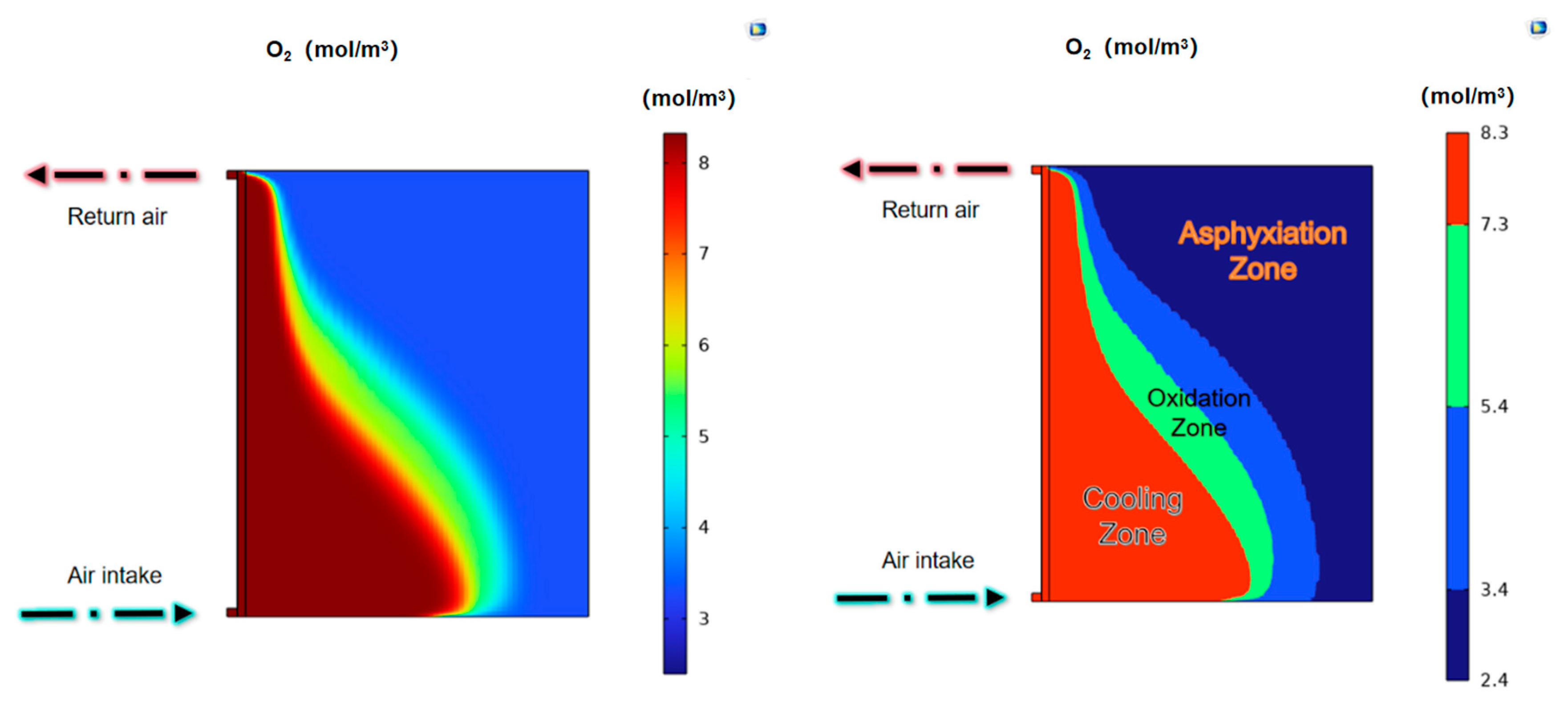 Figure 4. Numerical Simulation Results of Oxygen Transport Patterns in Uninjected CO2 Goafs and Distribution Characteristics of the ‘Triple Oxidation Zone’.