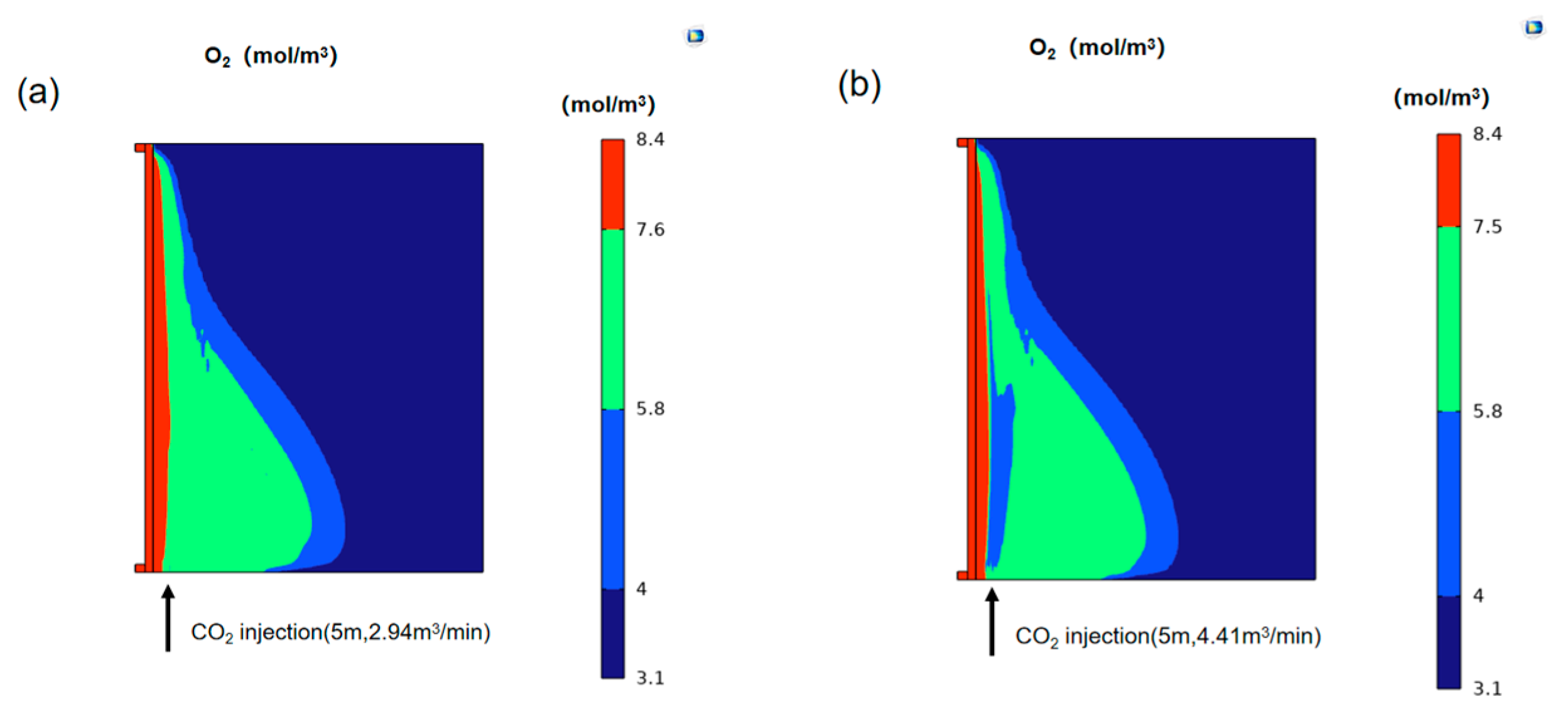 To enhance the credibility of the numerical model, the simulation results under the non-injection condition were compared with the findings from a similar study conducted by Li et al. in the Jiudaoling mine goaf [11]. Although direct field measurements for the ZF coal mine goaf are not available, this comparative approach provides an indirect validation of the model’s reliability.