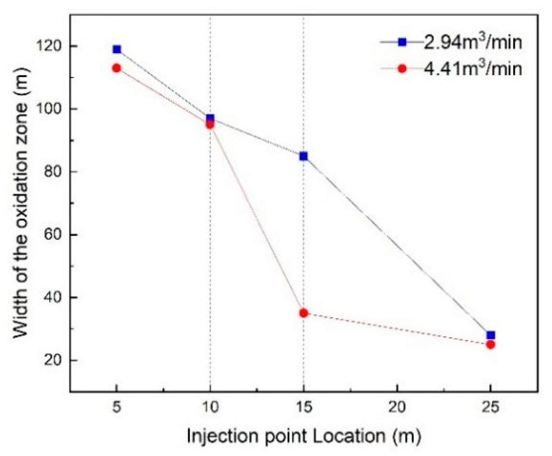 By comparing eight injection scenarios, it was determined that the most significant reduction in oxidation zone width occurs when the injection port is 15 m from the working face with a flow rate of 4.41 m3/min. This study found that, within the tested range, the injection location has a more dominant influence on the oxidation zone width than the injection flow rate. To quantitatively substantiate the claim that injection location plays a dominant role over flow rate, the average change in oxidation zone width was calculated. Varying the injection location (across 5, 10, 15 and 25 m) led to an average change in oxidation zone width of approximately 45 m per 10-m shift in location, when averaged over the two flow rates. In contrast, varying the injection flow rate (between 2.94 and 4.41 m3/min) resulted in an average change of only about 10 m per 1.47 m3/min flow rate increase, when averaged across all locations. This finding provides a significant refinement to the existing understanding. While Li et al. [12] identified an optimal location for the Jiudaoling mine and Huang et al. [13] determined optimal parameters for a coking coal mine, their studies were context-specific. Our work generalizes this concept by demonstrating that the injection location is a primary controlling factor. This implies that in practice, engineers should prioritize the precise positioning of injection ports before fine-tuning the flow rate. This strategic insight can significantly enhance the efficiency of fire prevention planning.