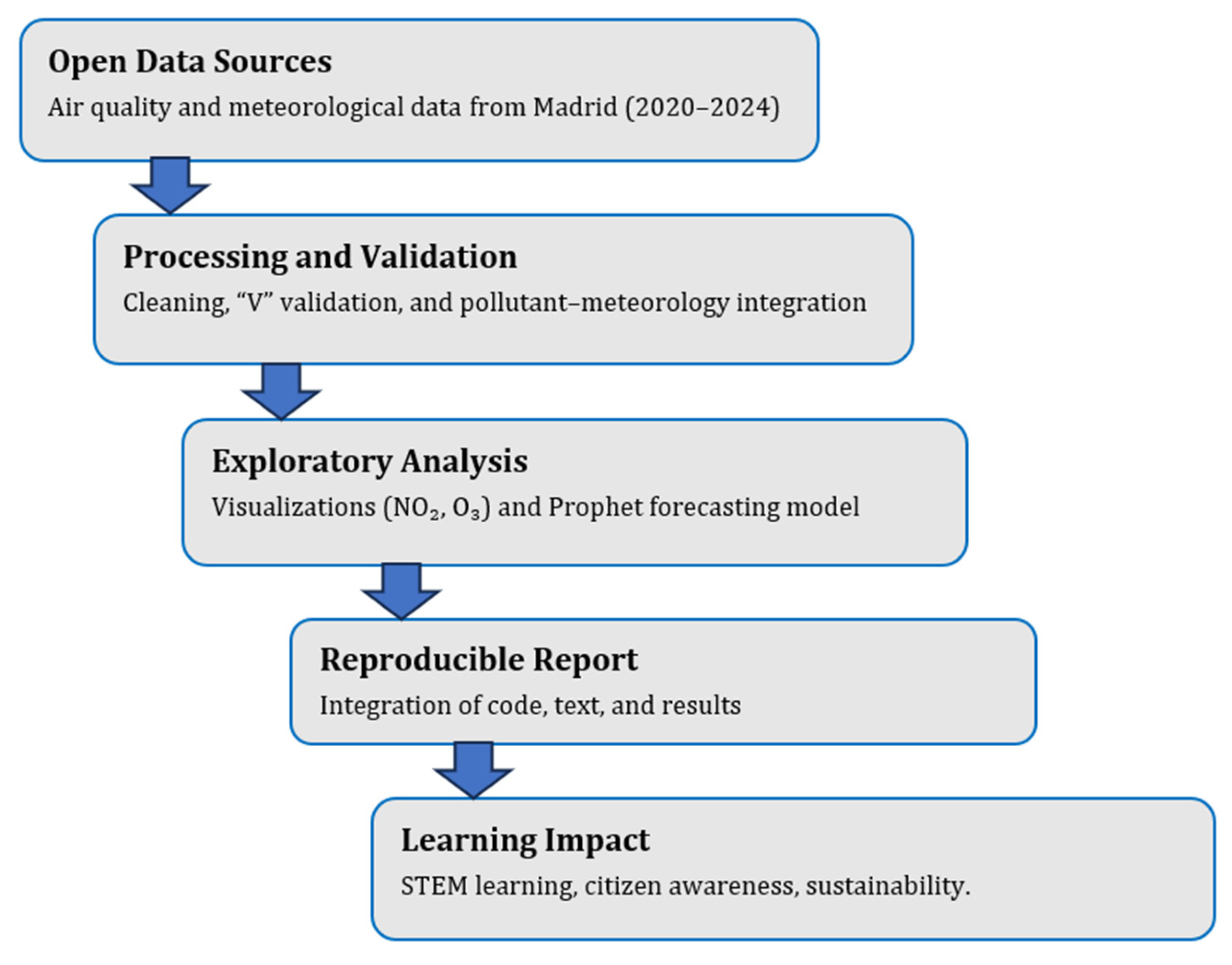 Figure 1. It illustrates the five main phases connecting open environmental datasets with reproducible analysis and educational outcomes. Each stage is described in the following subsections.