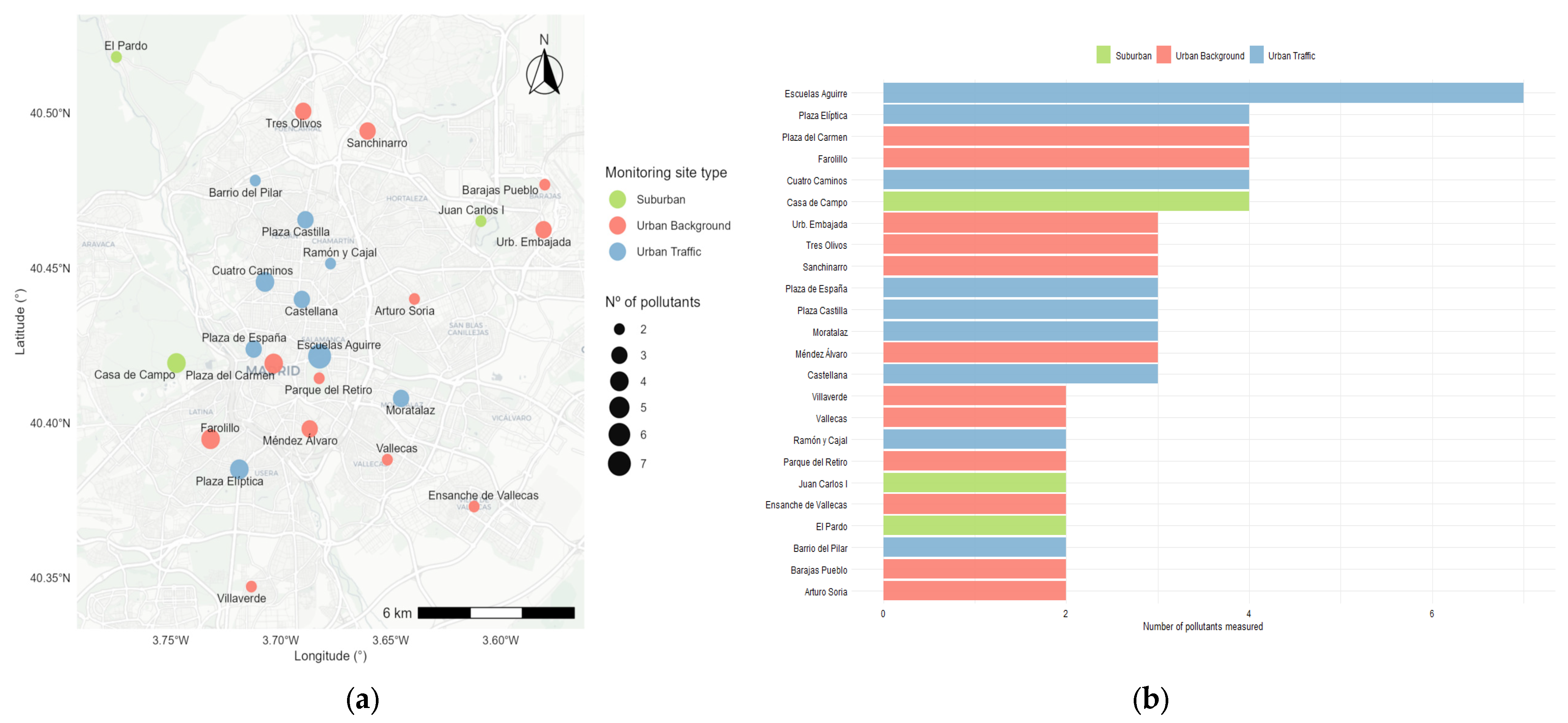 Figure 2b) details pollutant coverage for each station, showing that Urban Traffic sites measure the broadest range of pollutants, followed by Urban Background and Suburban locations. This configuration confirms the spatial and functional representativeness of Madrid’s monitoring network and its suitability for urban-scale analysis.
