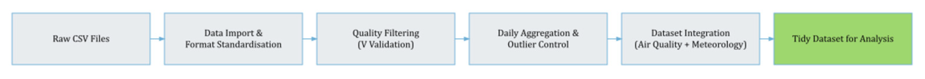 Figure 3 summarises the main stages of the cleaning and validation pipeline, from the import of raw CSV files to the integration of validated air-quality and meteorological data.