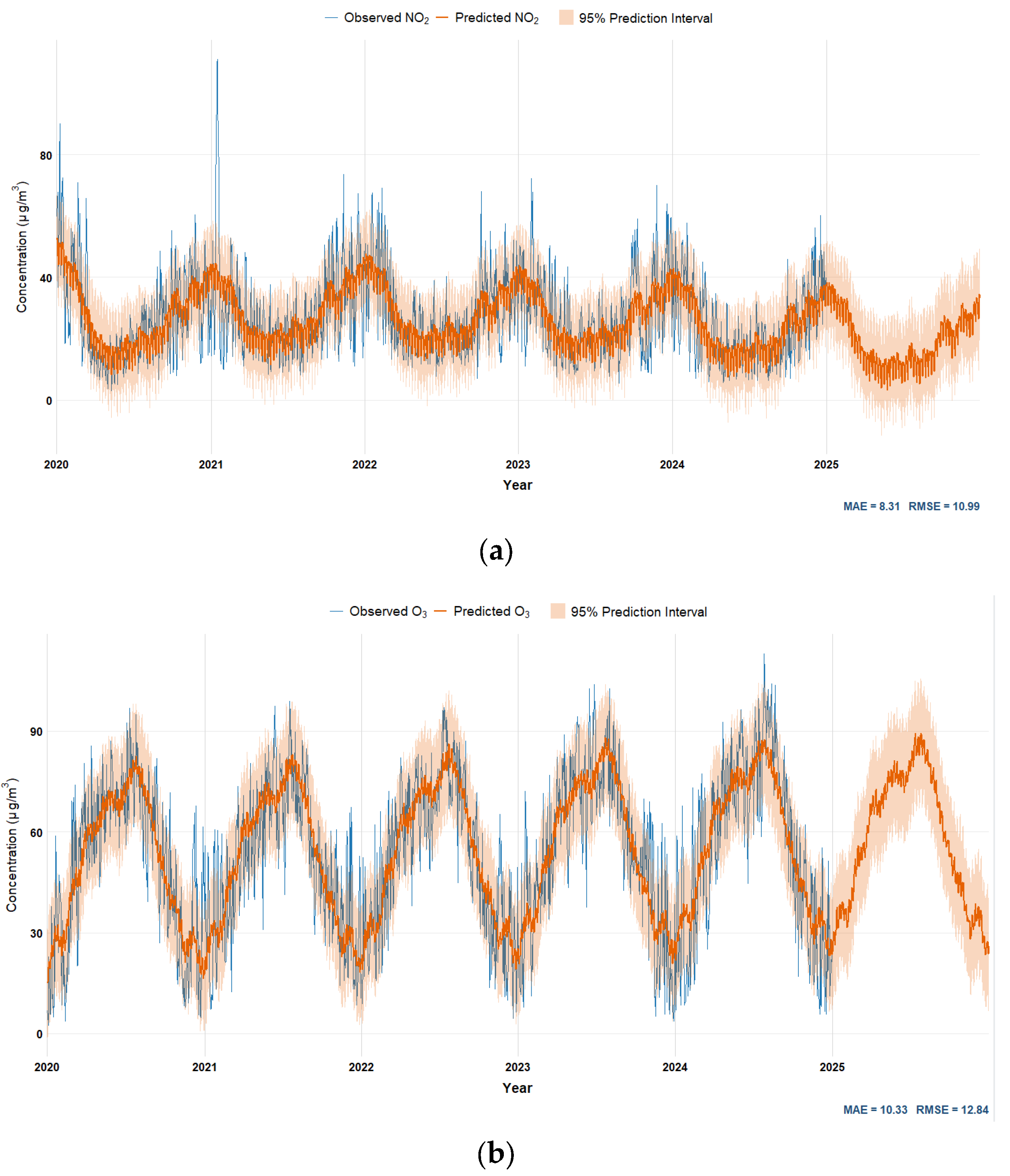 Figure 5 presents the observed and Prophet-predicted daily concentrations of NO