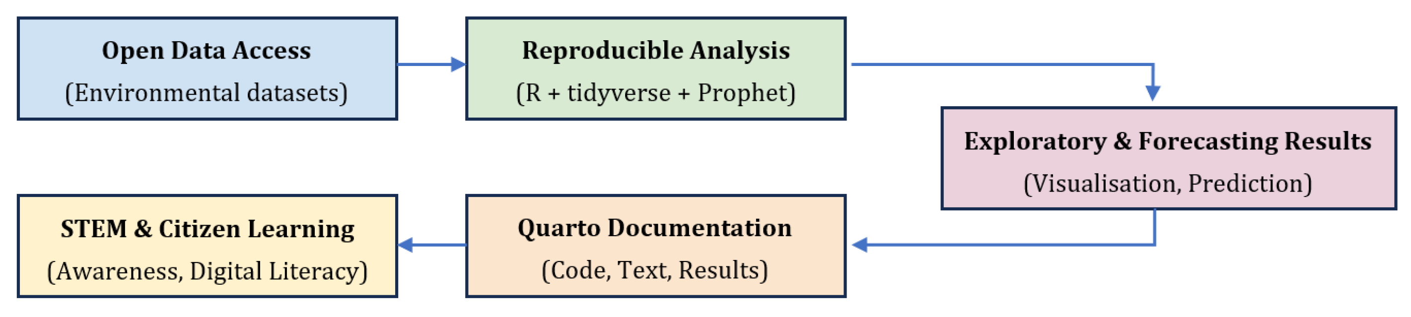 Figure 6 illustrates the learning and reproducibility ecosystem linking open data, computational analysis, and STEM education through the Quarto–R environment. By integrating IoT sensor data and AI forecasting within this environment, the workflow extends reproducibility beyond computation, enabling learners to engage with live environmental information in near real time. The diagram shows how environmental datasets feed into reproducible analysis (R + tidyverse + Prophet), exploratory forecasting, and documentation, ultimately supporting STEM and citizen learning.