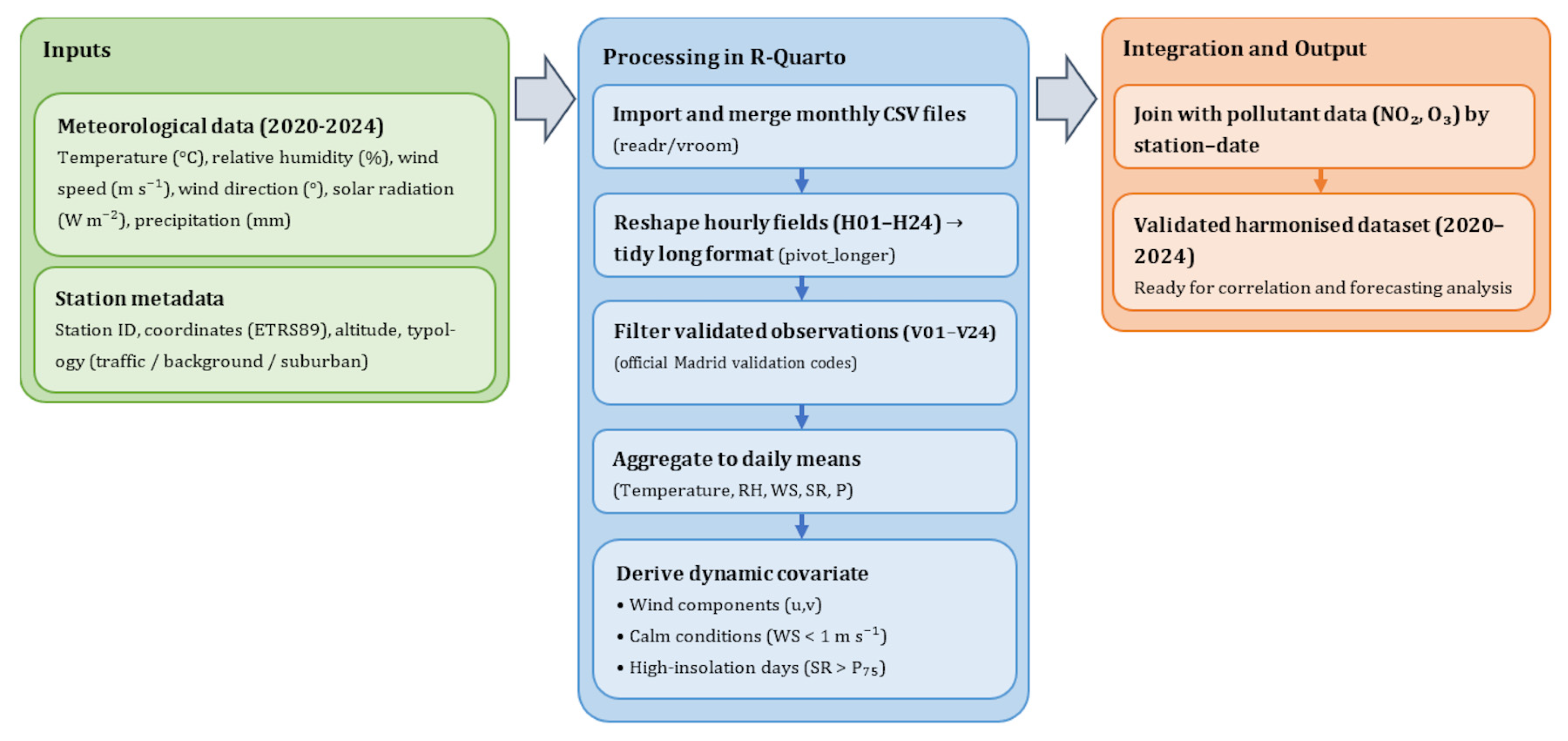 Column structures were reshaped through pivoting operations to harmonise pollutant readings across hourly files, and variable names were unified according to the metadata scheme of the Madrid Open Data Portal. The resulting datasets were merged by station code and date, generating a tidy, analysis-ready structure consistent with the reproducible standards of the tidyverse ecosystem [