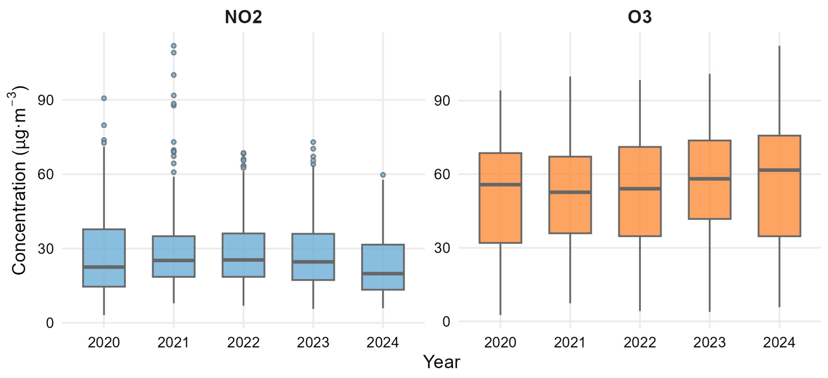 37]. The narrower interquartile ranges observed after 2021 indicate more homogeneous background levels, although occasional winter peaks persist due to local traffic episodes.