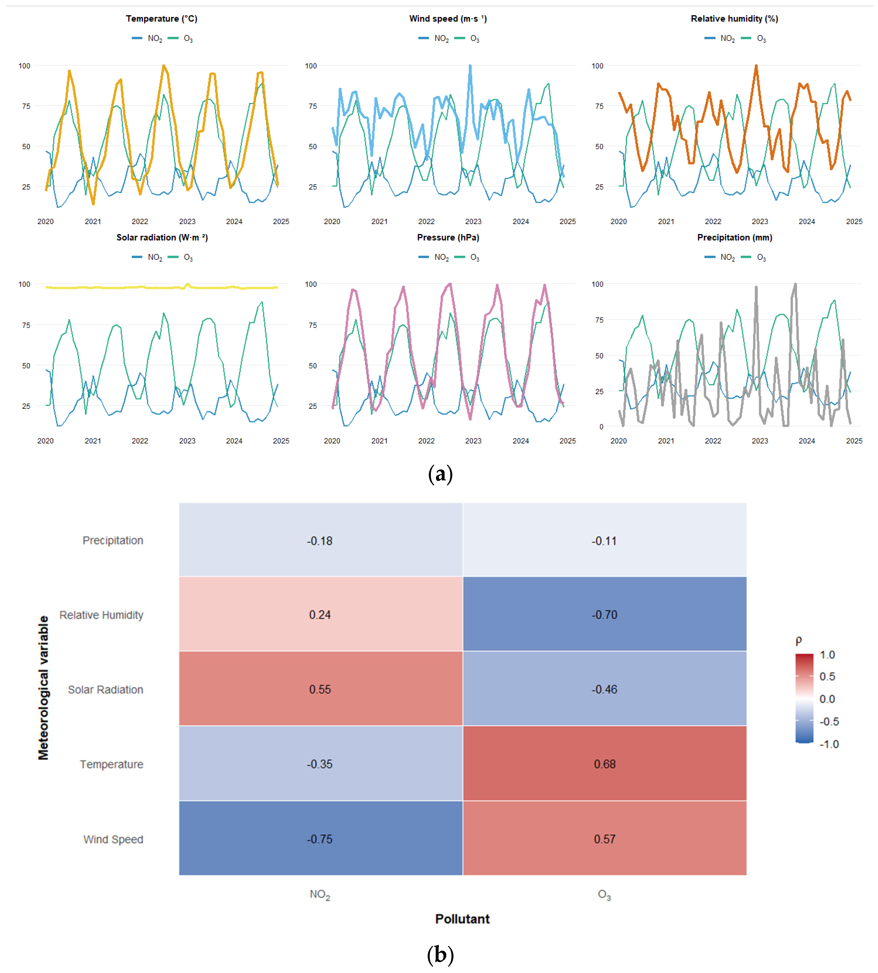 3 shows strong positive correlations with temperature (ρ = 0.68) and solar radiation (ρ = 0.55), confirming its photochemical dependence on thermal and radiative conditions. In contrast, NO