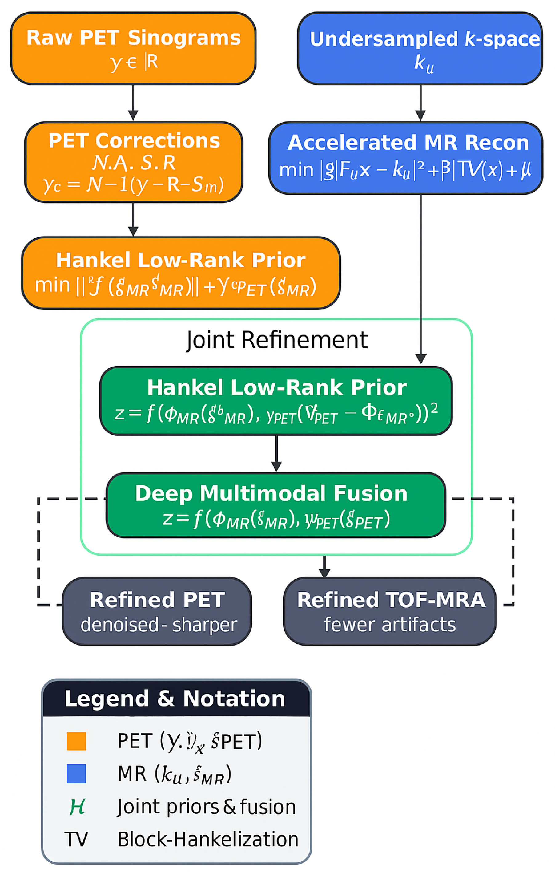 Joint MR–PET reconstruction represents a promising direction by exploiting cross-modal correlations. Prior methods based on joint total variation (jTV) or joint sparsity regularization have shown improvements over independent reconstructions [
