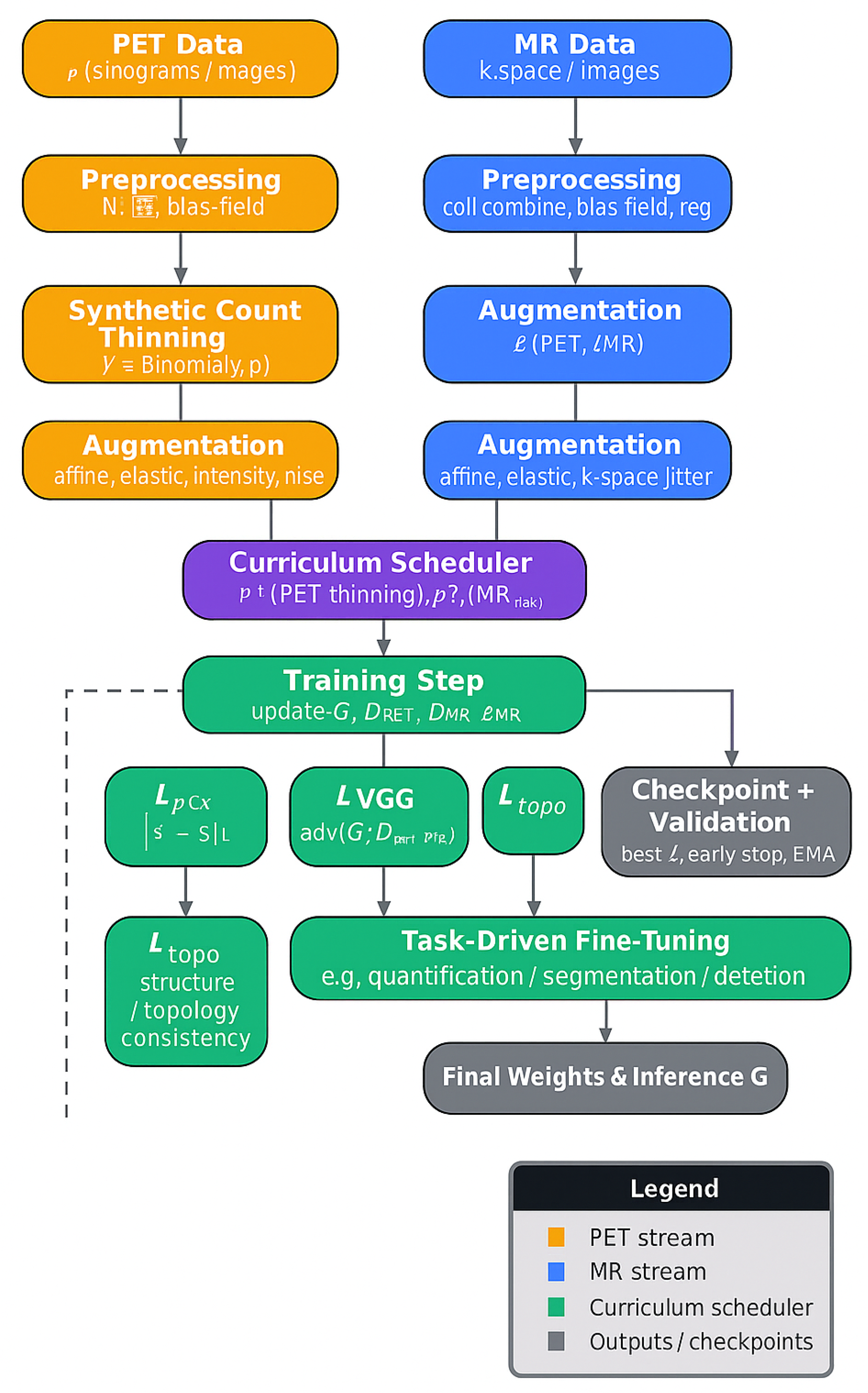 To support reproducibility, a structured description of the hyperparameters, training curriculum, and data preparation steps (including synthetic undersampling and low-count simulation) is provided within this manuscript. The framework was implemented as a modular pipeline with three interchangeable components: (i) physics-consistent projection blocks, (ii) cross-modal fusion modules, and (iii) topology-preserving loss terms. This design enables ablation, backbone replacement, or substitution of priors without altering the overall training logic.