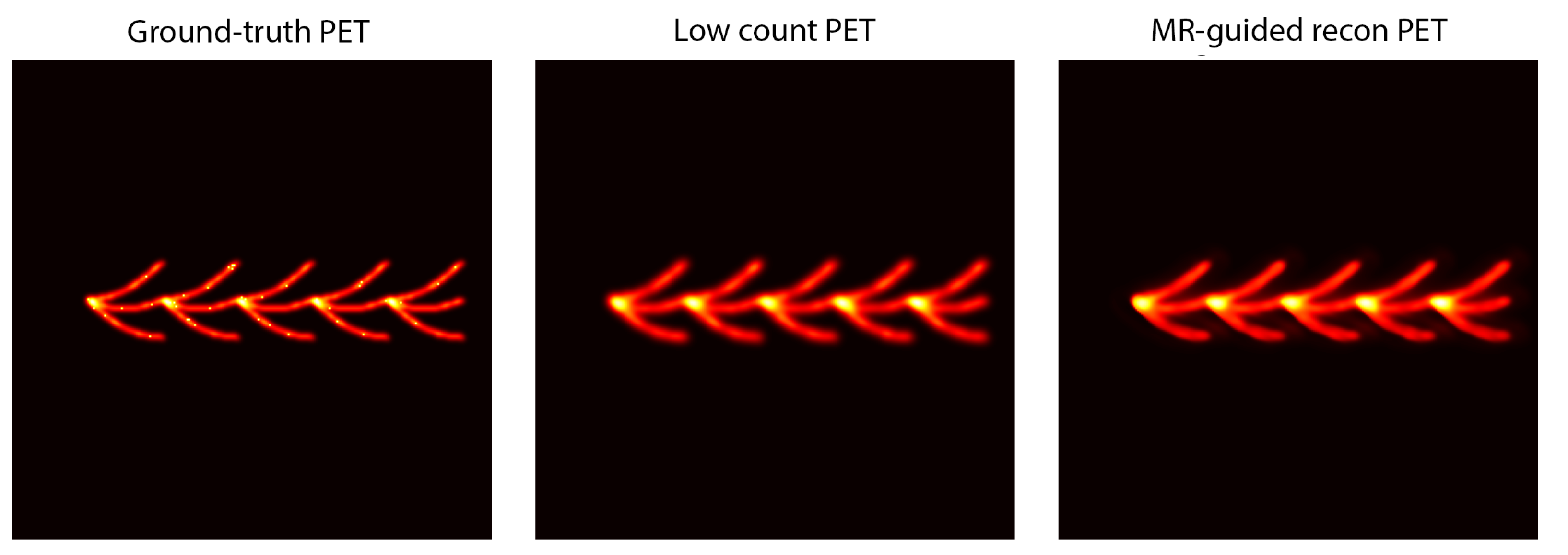 35]. MRI-guided PET priors (e.g., Bowsher, joint TV, or patch-based denoising) [