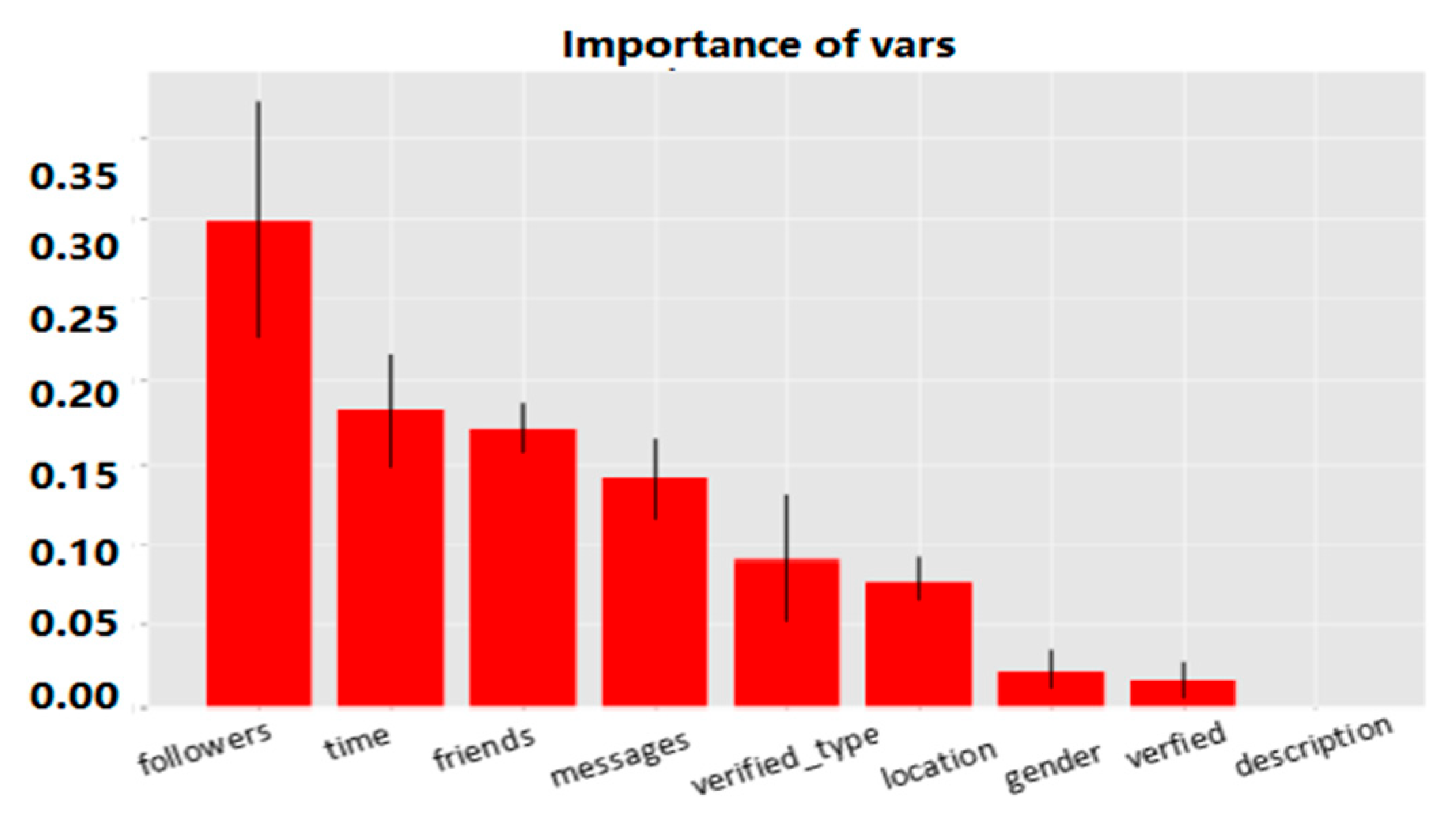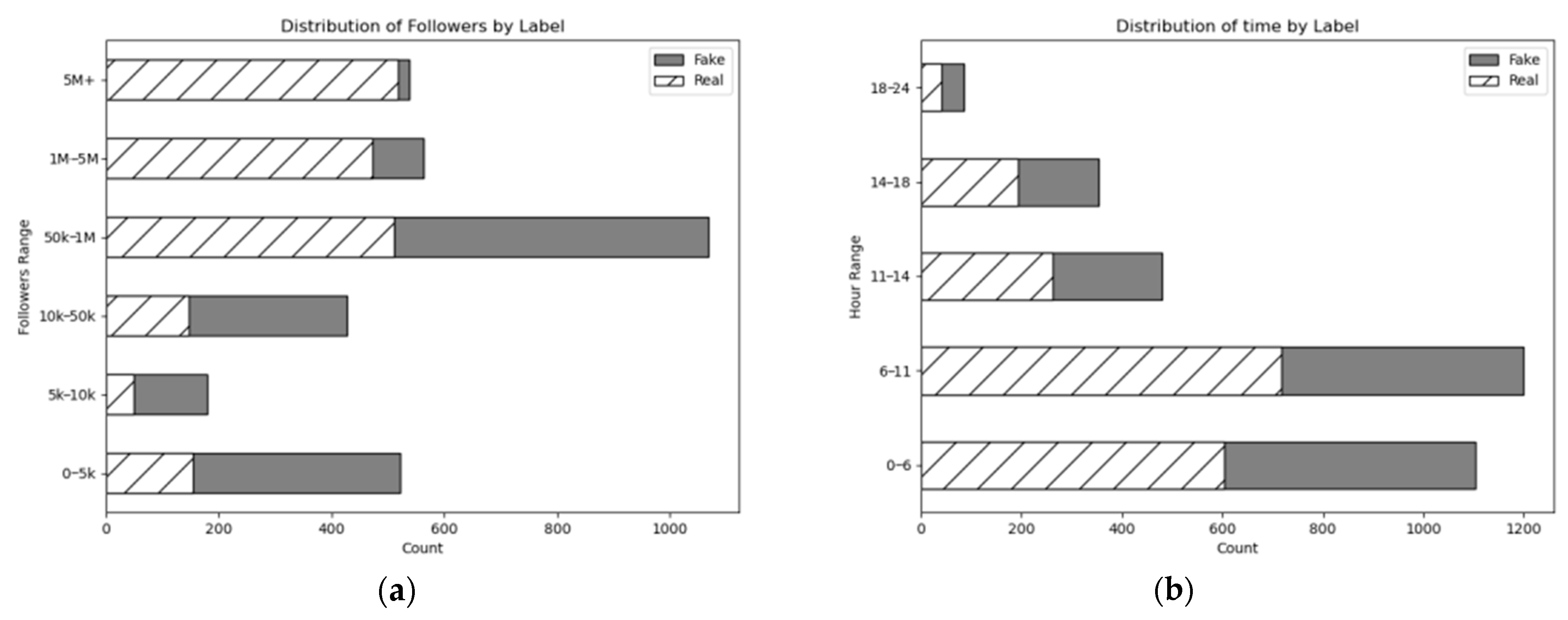Figure 7b,c shows nearly identical distributions of real and fake news across intervals (approximating 1:1 ratios). Incorporating such statistically neutral features would impair classification performance. Consequently, we retain only three discriminative attributes: followers_count, message_count, and verified_type.
