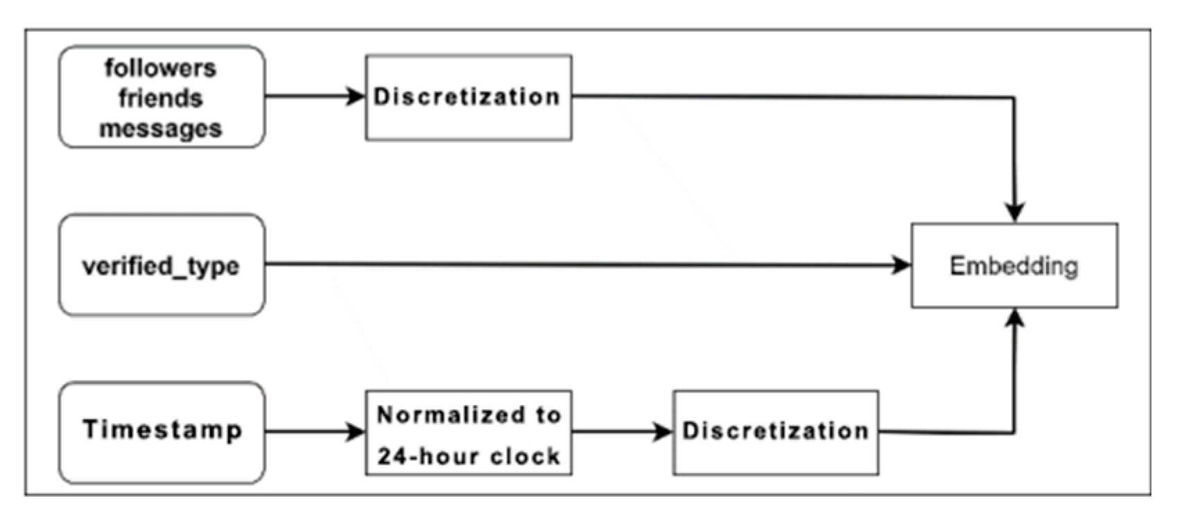 Based on the user attribute importance ranking obtained in the previous Section Analysis of User Attribute Importance, the top five attributes—follows, time, verified_type, friends, and messages—were further processed to derive the feature distribution of each user attribute. The process of user attribute data processing is illustrated in
