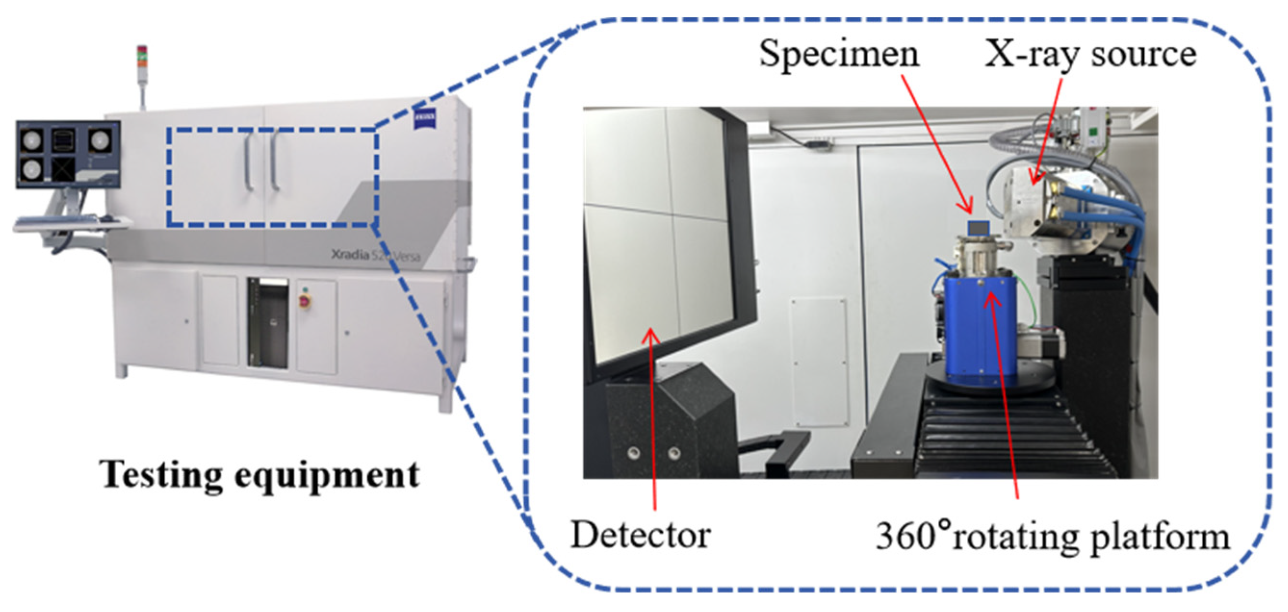 These methods often require comprehensive selection based on the detection requirements, cost budget and on-site conditions in practical applications. Multiple technologies are combined to leverage their respective advantages. This study adopted X-ray micro-computed tomography (Micro-CT) non-destructive testing technology, which combines X-ray microscopy and computed tomography. It can achieve three-dimensional visualization and quantitative analysis of the internal structure of materials without damaging the specimens. Compared with traditional methods such as ultrasonic testing or optical microscopy, Micro-CT can not only clearly present the morphology and spatial distribution of defects, but also accurately calculate the volume and quantity of defects, providing important basis for the quality control and research of composite materials [