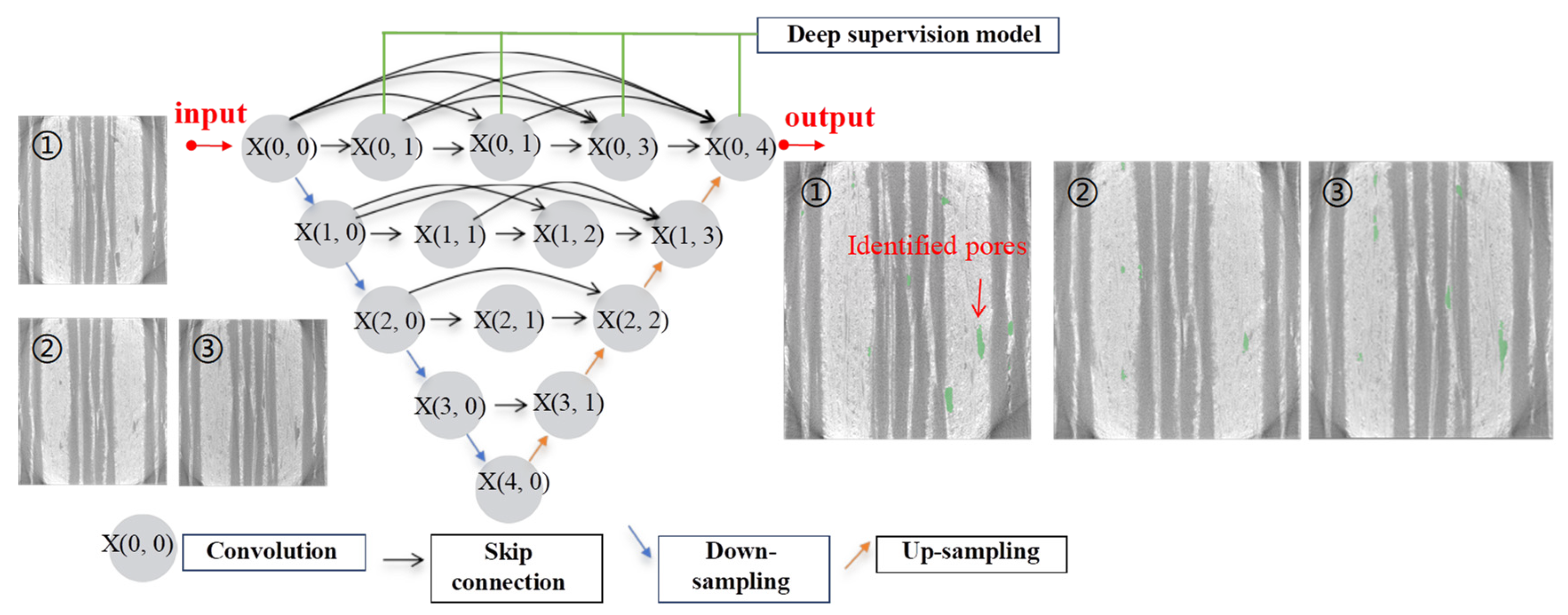 U-Net++ demonstrates significant advantages in such tasks with its nested dense skip connection structure. Unlike U-Net, which simply concatenates the shallow features from the encoder with the deep features from the decoder, U-Net++ introduces intermediate convolutional layers and dense connection paths to construct a “feature optimization pipeline”. The detailed but semantically ambiguous features captured by the shallow layers of the encoder (such as possible noise points and weak edge gradients) are fused and reprocessed with the features at the same scale that have undergone deeper “understanding” before being passed to the corresponding deep layers of the decoder. This process effectively enhances the response of the true pore edges while suppressing the background noise caused by the texture of the fiber bundles. Ultimately, the deep layers of the decoder obtain feature maps that have been gradually refined and semantically enhanced, enabling more accurate reconstruction of the complete pore morphology and significantly improving the segmentation accuracy and robustness for small pores, low-contrast pores and complex-shaped pores, effectively reducing misjudgments and omissions. After the application of deep learning, interlayer pores and intralayer pores can be accurately identified, providing strong support for subsequent pore analysis.