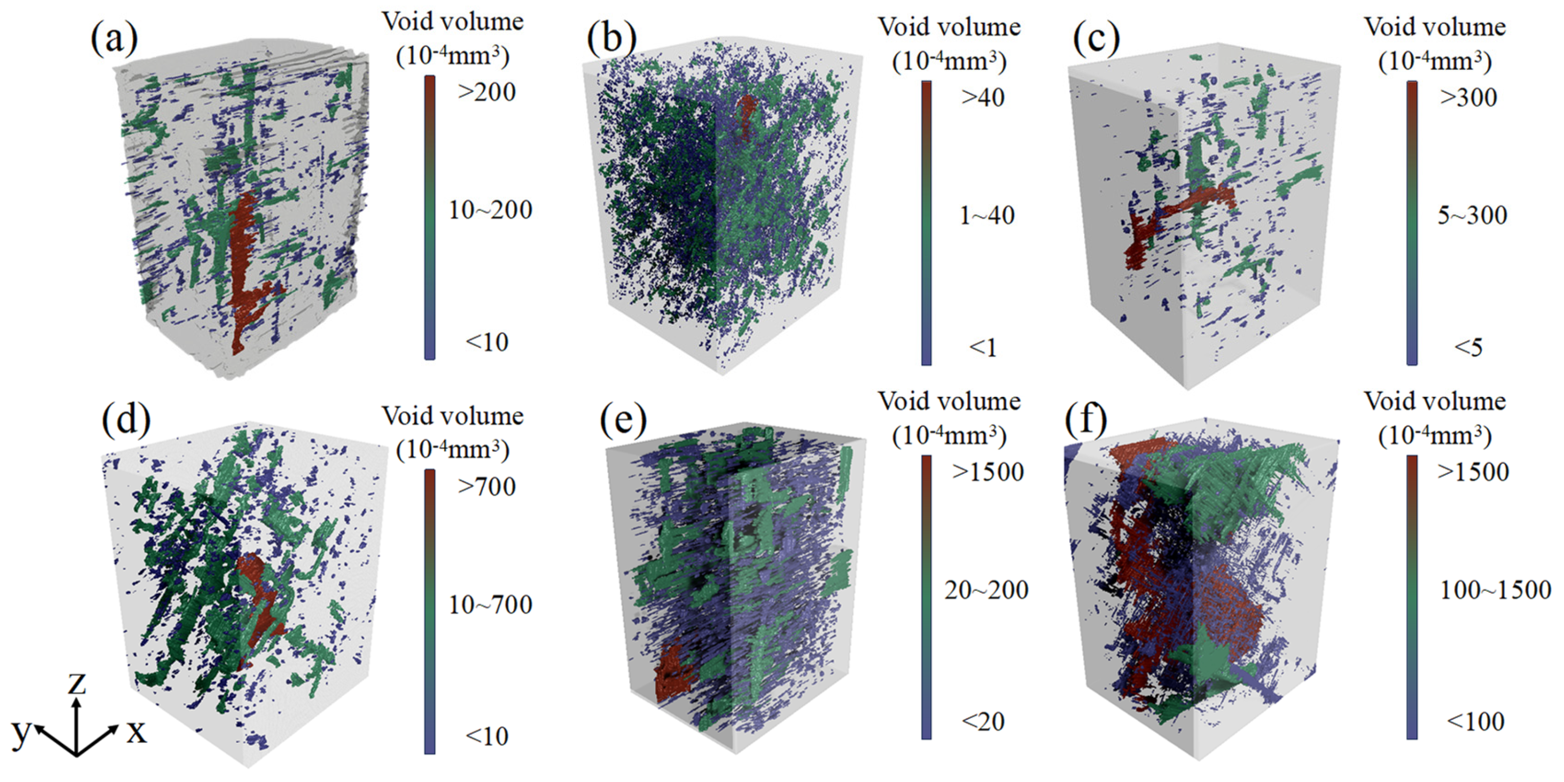 Figure 7 presents the internal pore space distribution models of six different types of laminates after deep learning segmentation and 3D reconstruction. To visually compare the distribution patterns of pores of different sizes, the pores in the figure are color-coded according to their volume: large (red, e.g., >200 × 10
